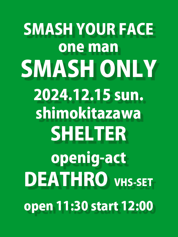 SCHEDULE 2024 12 15 Sunday DAY EVENT SMASH YOUR FACE one man -SMASH ONLY- OPEN 11:30 - START 12:00 Tweet SMASH YOUR FACE O.A.DEATHRO(VHS-SET) TICKETADV¥3000 / DOOR¥3500 ※10代/学生はチケット代無料、1Dのみ(受付で証明物を提示) 【発売日】 BAND予約 https://asunaroworks.kawaiishop.jp/items/94937530 Share