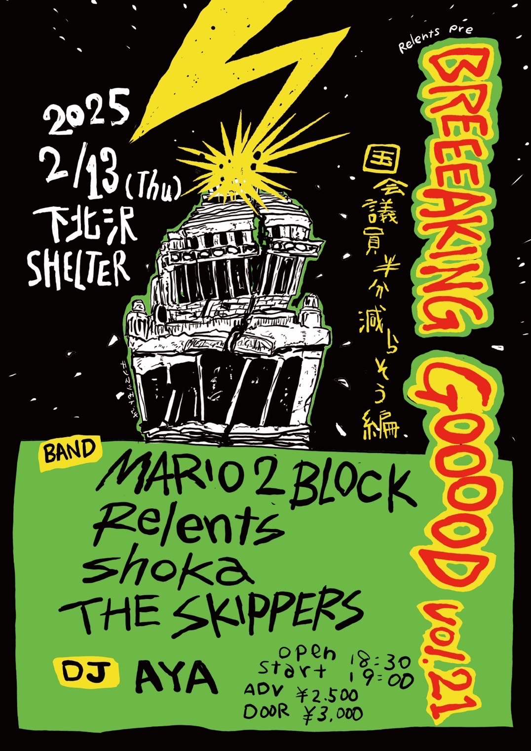 SCHEDULE 2025 02 13 Thursday Relents pre BREEEAKING GOOOD!!vol.21 -国会議員半分減らそう編- OPEN 18:30 - START 19:00 Tweet Relents MARIO2BLOCK shoka THE SKIPPERS DJ:AYA TICKETADV¥2500 / DOOR¥3000 【発売日】 BAND予約 #Relents#MARIO2BLOCK#shoka#THE SKIPPERS#[DJ] AYA Share