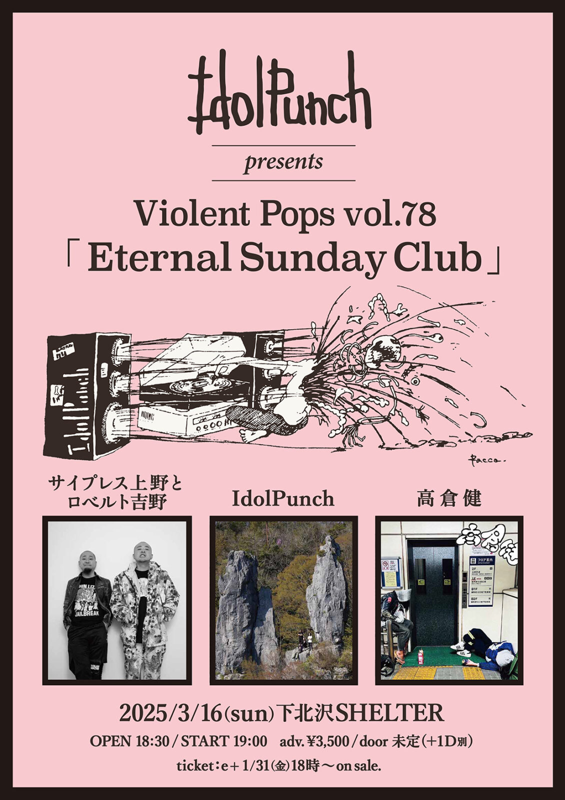 SCHEDULE 2025 03 16 Sunday IdolPunch presents ViolentPops vol.78 『Eternal Sunday Club』 OPEN 18:30 - START 19:00 Tweet IdolPunch サイプレス上野とロベルト吉野 高倉健 TICKETADV¥3500 / DOOR¥未定 【発売日】 1/31 18時〜e+ #IdolPunch#サイプレス上野とロベルト吉野#高倉健 Share