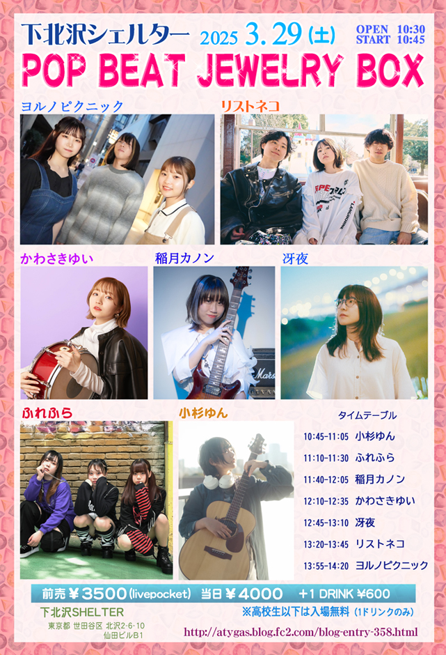 SCHEDULE 2025 03 29 Saturday DAY EVENT 『POP BEAT JWEWRY BOX』 OPEN 10:30 - START 10:45 Tweet ヨルノピクニック リストネコ ふれふら 冴夜 かわさきゆい 稲月カノン 小杉ゆん TICKETADV¥3500 / DOOR¥4000 / 高校生以下入場無料(1Dのみ) 【発売日】 1/31 20時〜Livepocket #冴夜#ヨルノピクニック#かわさきゆい#稲月カノン Share