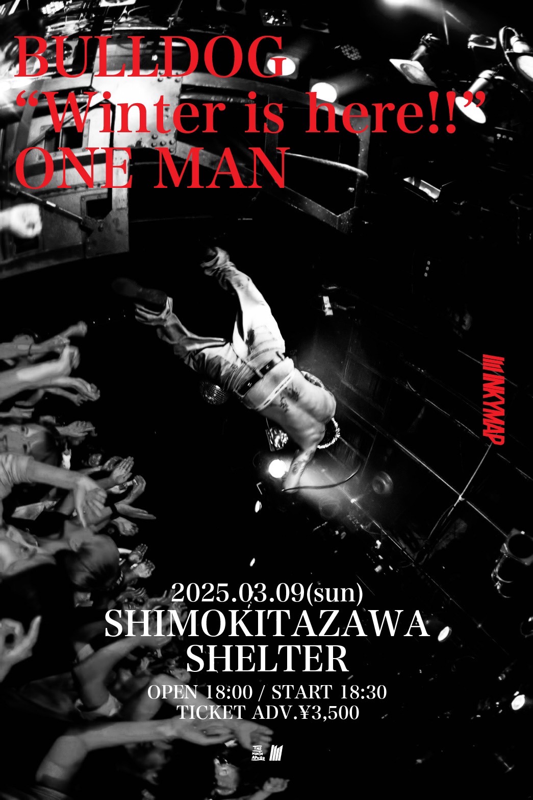SCHEDULE 2025 03 09 Sunday INKYMAP BULLDOG “Winter is here!!” ONE MAN OPEN 18:00 - START 18:30 Tweet INKYMAP TICKETADV¥3500 / DOOR¥4000 【発売日】 e+ https://eplus.jp/bulldog/ #INKYMAP Share
