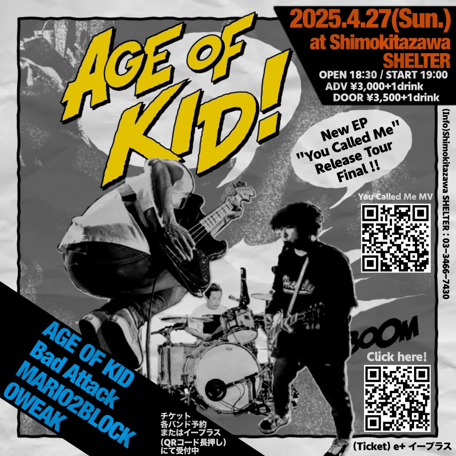 SCHEDULE 2025 04 27 Sunday AGE OF KID ~You Called Me Tour 2025~ OPEN 18:30 - START 19:00 Tweet AGE OF KID Bad Attack MARIO2BLOCK OWEAK TICKETADV¥3000 / DOOR¥3500 【発売日】 2/8〜e+・各BAND予約 #AGE OF KID#Bad Attack#MARIO2BLOCK#OWEAK Share