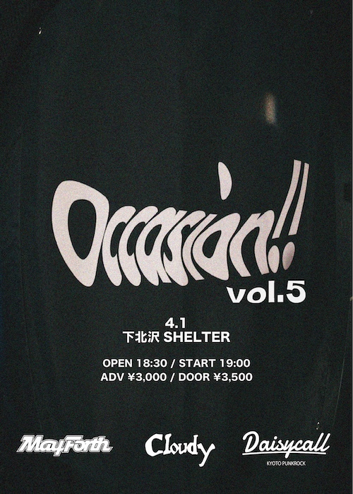 SCHEDULE 2025 04 01 Tuesday Occasion!! vol.5 OPEN 18:30 - START 19:00 Tweet Cloudy Daisycall May Forth TICKETADV¥3000 / DOOR¥3500 【発売日】 2/1〜e+ eplus.jp/occasion/ 問い合わせ:サンライズプロモーション東京 0570-00-3337(平日12:00-15:00) #Cloudy#Daisycall#May Forth Share