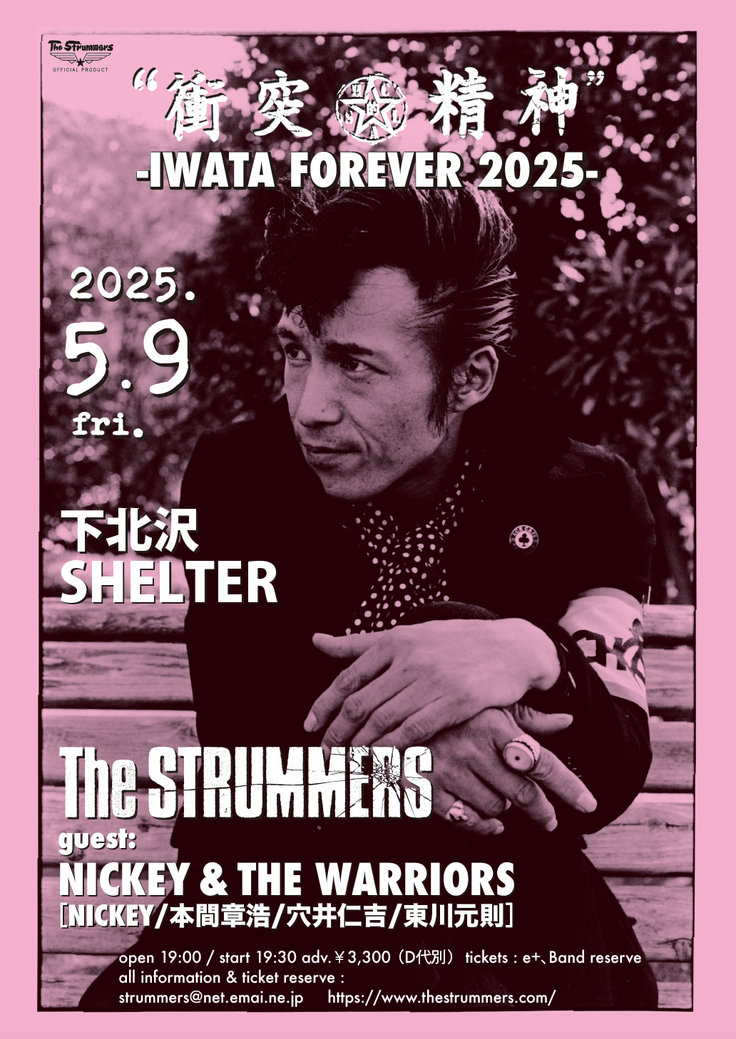 SCHEDULE 2025 05 09 Friday “衝突的精神” -IWATA FOREVER 2025- OPEN 19:00 - START 19:30 Tweet The STRUMMERS GUEST:NICKEY & THE WARRIORS [NICKEY/本間章浩/穴井仁吉/東川元則] TICKET※録音・撮影禁止 ADV¥3300 / DOOR¥3900 【発売日】 2/15〜e+ #The STRUMMERS#NICKEY & THE WARRIORS Share