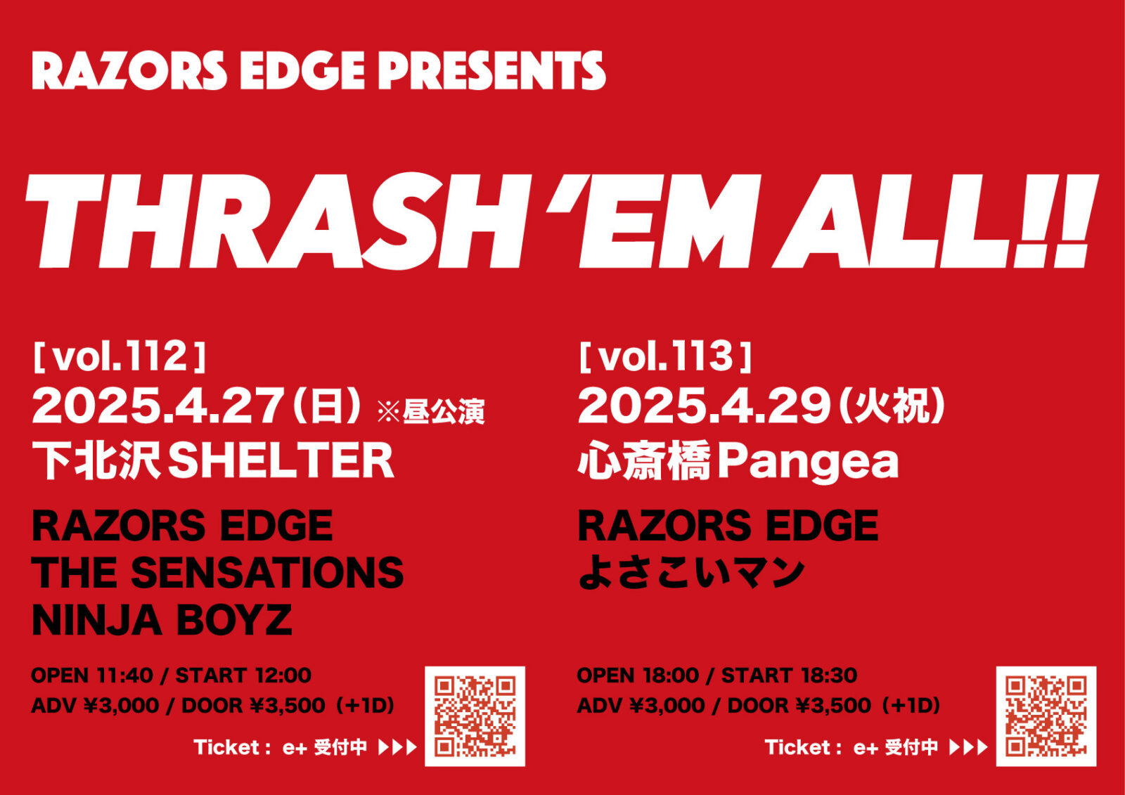SCHEDULE 2025 04 27 Sunday DAY EVENT RAZORS EDGE presents「THRASH’EM ALL!! Vol.112」 OPEN 11:40 - START 12:00 Tweet RAZORS EDGE THE SENSATIONS NINJA BOYZ TICKETADV¥3000 / DOOR¥3500 【発売日】 3/12〜e+ https://eplus.jp/sf/detail/4289780001-P0030001 #RAZORS EDGE#THE SENSATIONS#NINJA BOYZ Share