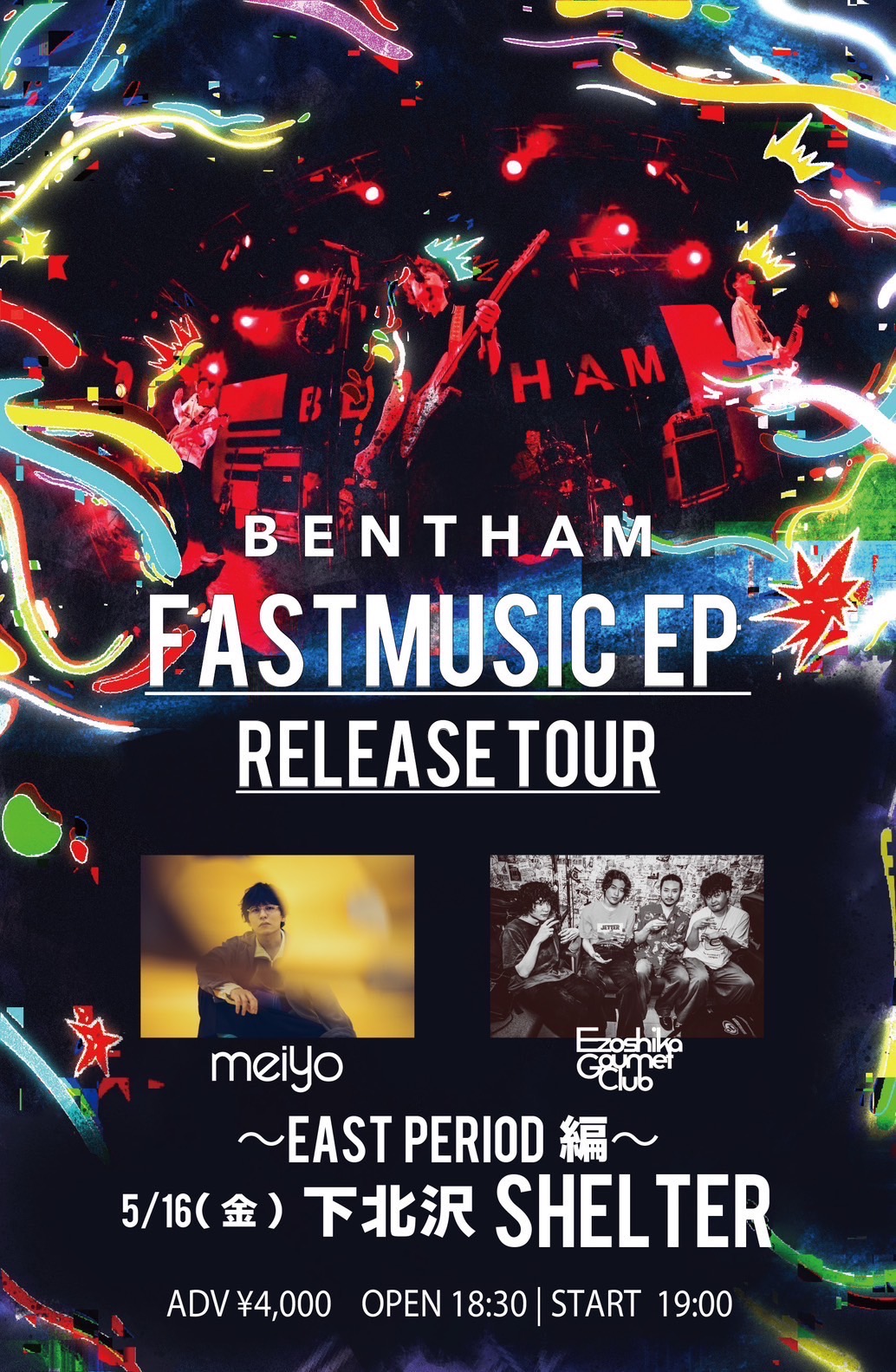 SCHEDULE 2025 05 16 Friday FASTMUSIC EP Release tour EAST PERIOD編 OPEN 18:30 - START 19:00 Tweet Bentham meiyo エゾシカグルメクラブ TICKETADV¥4000 / DOOR¥4500 【発売日】 3/24〜e+ https://eplus.jp/bentham/ ※FC先行有 Share