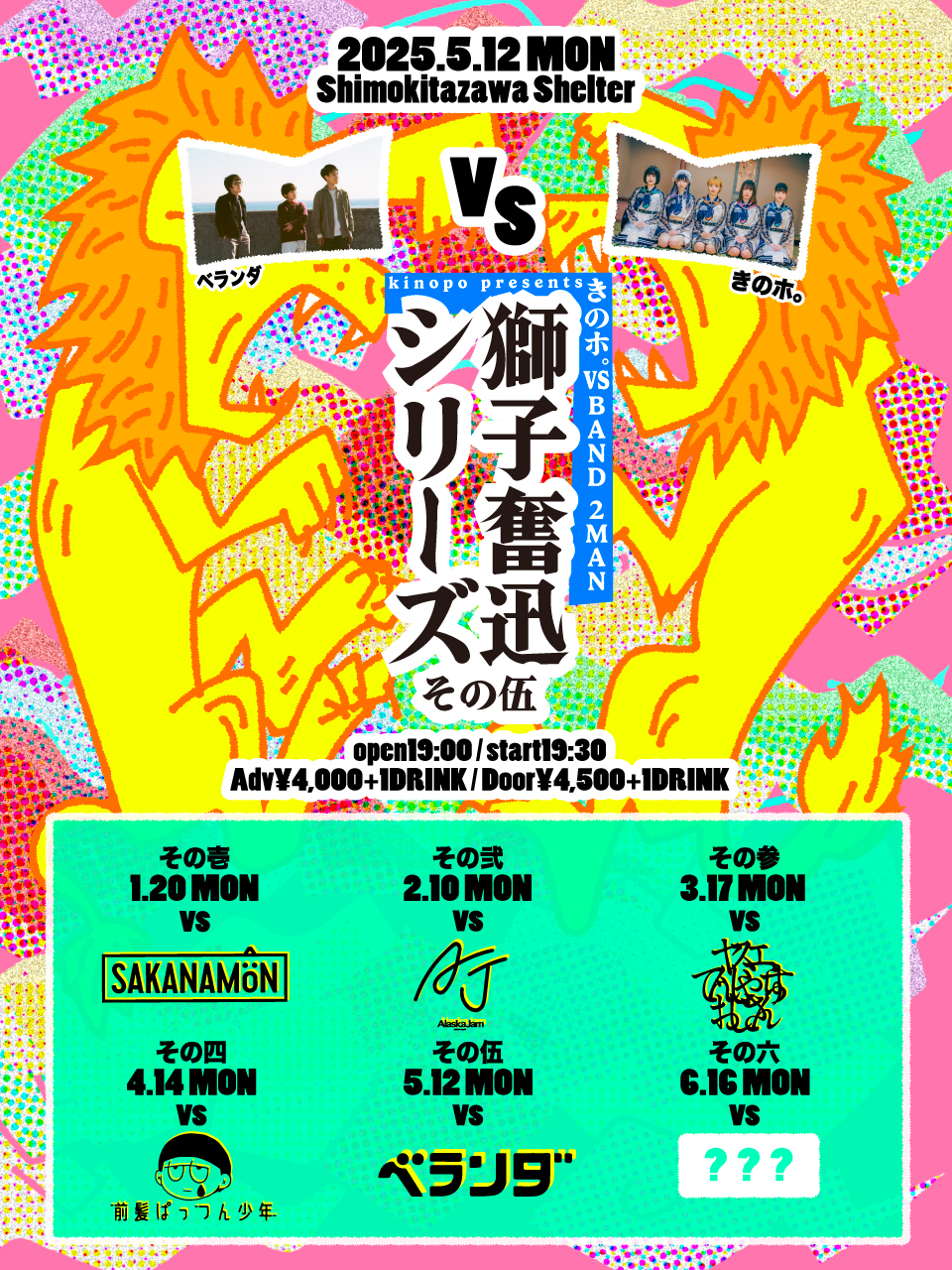 SCHEDULE 2025 05 12 Monday きのホ。vs BAND 2MAN 【獅子奮迅】 その伍 vs ベランダ OPEN 19:00 - START 19:30 Tweet きのホ。 ベランダ TICKETADV¥4000 / DOOR¥4500 【発売日】 3/18〜Livepocket https://t.livepocket.jp/e/1_rr1 #きのホ。#ベランダ Share