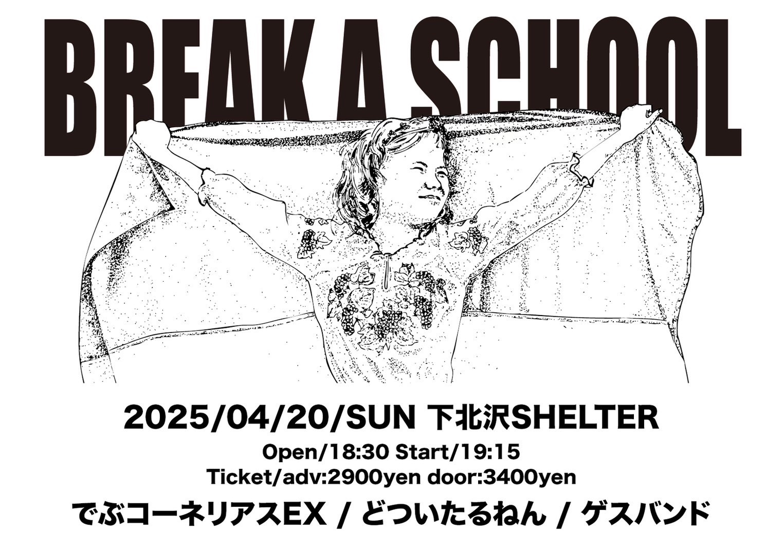 SCHEDULE 2025 04 20 Sunday BREAK A SCHOOL OPEN 18:30 - START 19:15 Tweet でぶコーネリアスEX どついたるねん ゲスバンド TICKETADV¥2900 / DOOR¥3400 【発売日】 各BAND予約・SHELTER予約 #でぶコーネリアスEX#どついたるねん#ゲスバンド Share このイベントの予約は締めきりました。