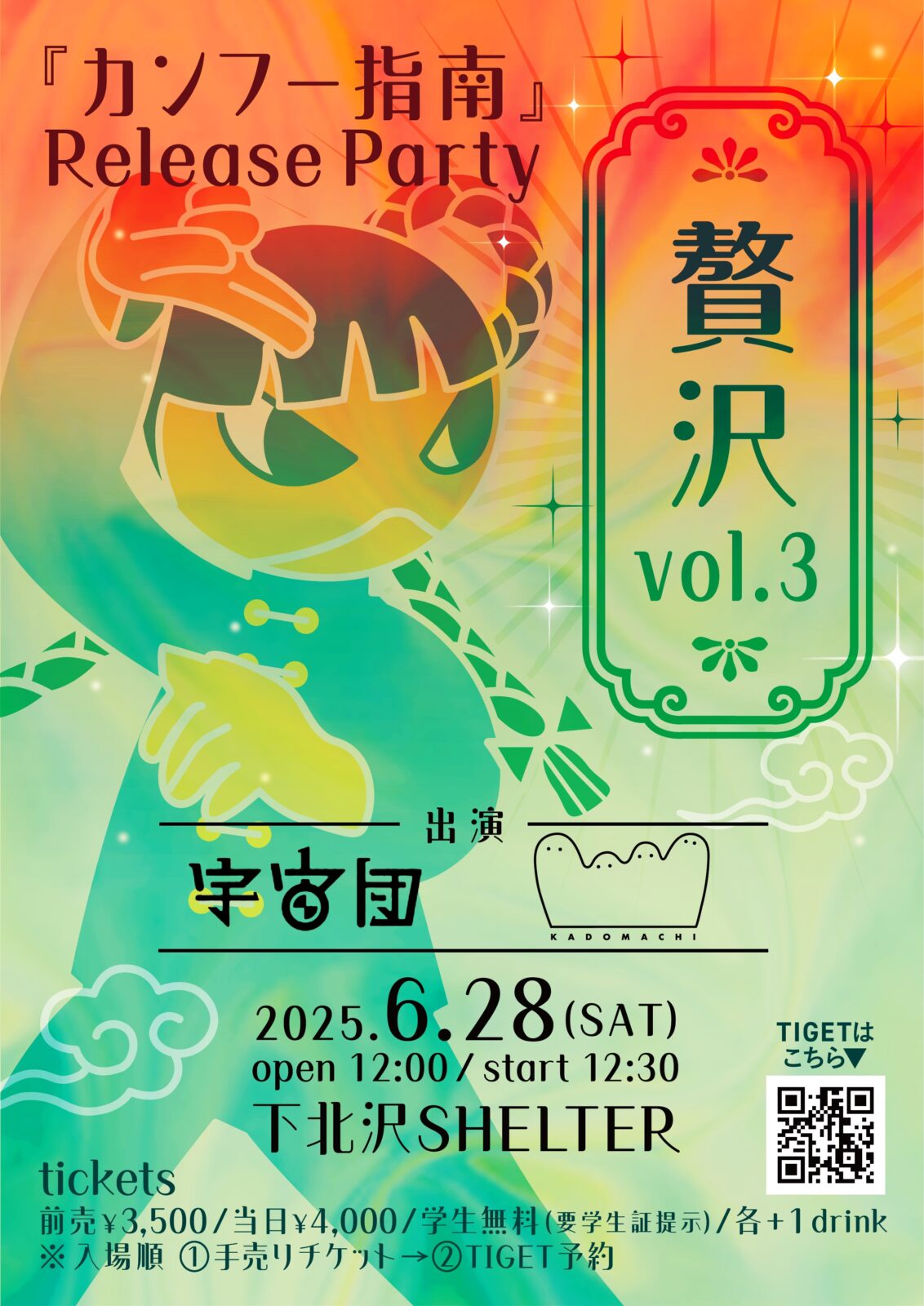 SCHEDULE 2025 06 28 Saturday DAY EVENT 宇宙団pre.”贅沢vol.3 『カンフー指南』Release Party” OPEN 12:00 - START 12:30 Tweet 宇宙団 KADOMACHI TICKETADV¥3500 / DOOR¥4000 【発売日】 TIGET予約 https://tiget.net/events/388320 Share