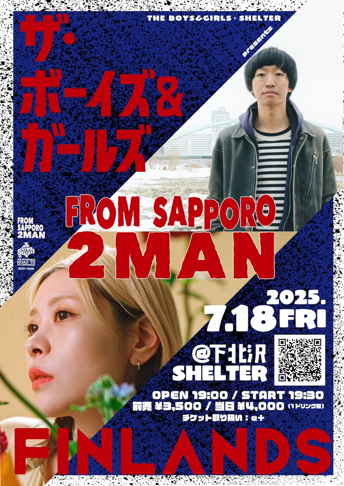 SCHEDULE 2025 07 18 Friday THE BOYS&GIRLS×SHELTER FROM SAPPORO 2MAN OPEN 19:00 - START 19:30 Tweet THE BOYS&GIRLS FINLANDS TICKETADV¥3500 / DOOR¥4000 【発売日】 e+ e+二次先行プレオーダー:4/18〜4/27 23:59 https://eplus.jp/sf/detail/4290460001-P0030001 #THE BOYS&GIRLS#FINLANDS Share