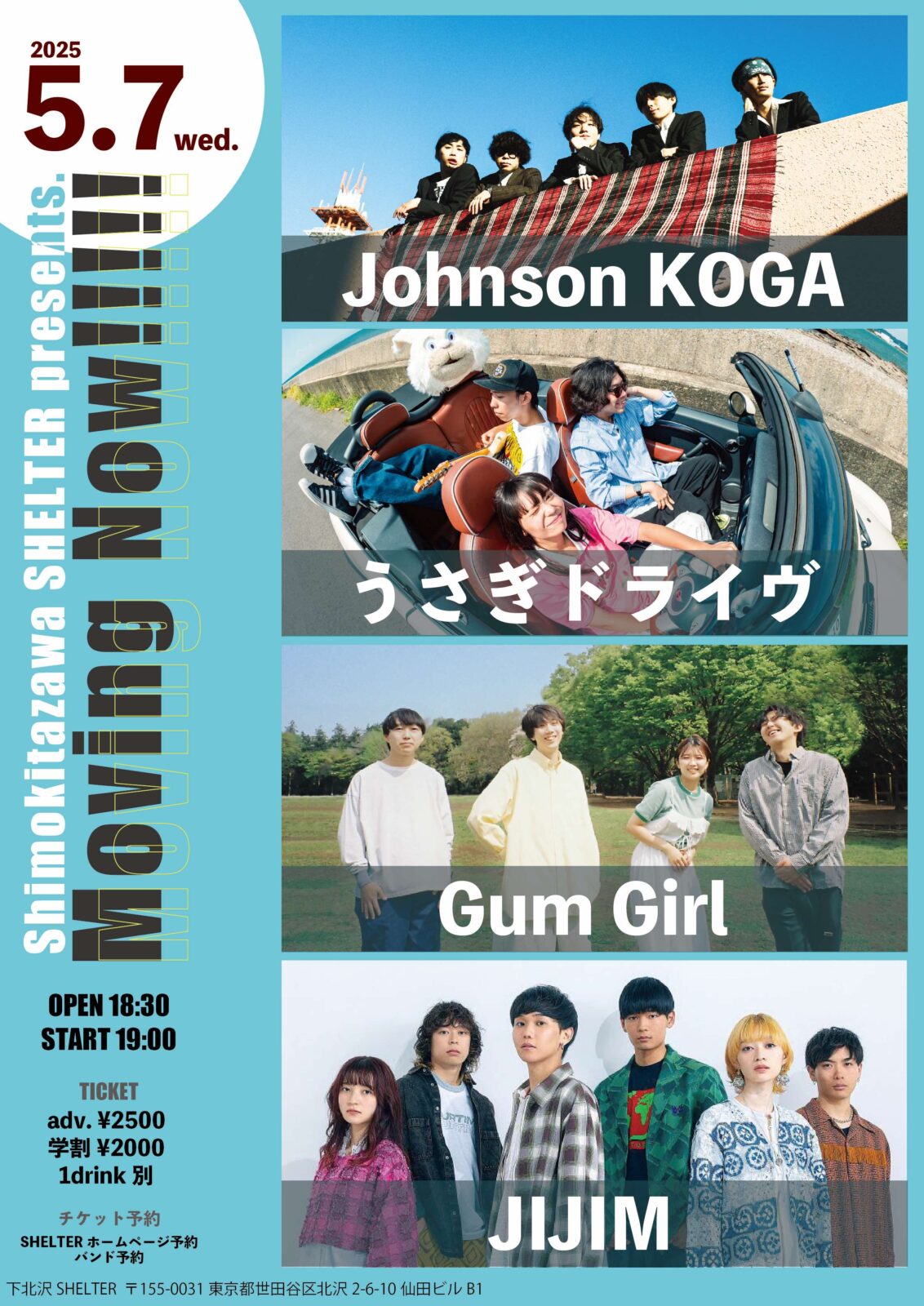 SCHEDULE 2025 05 07 Wednesday 下北沢SHELTER presents. Moving Now!!!!! OPEN 18:30 - START 19:00 Tweet Johnson KOGA うさぎドライヴ Gum Girl JIJIM TICKETADV¥2500 / 学割¥2000 SHELTER HP予約/各バンド予約 #Johnson KOGA#うさぎドライヴ#Gum Girl#JIJIM Share このイベントの予約は締めきりました。