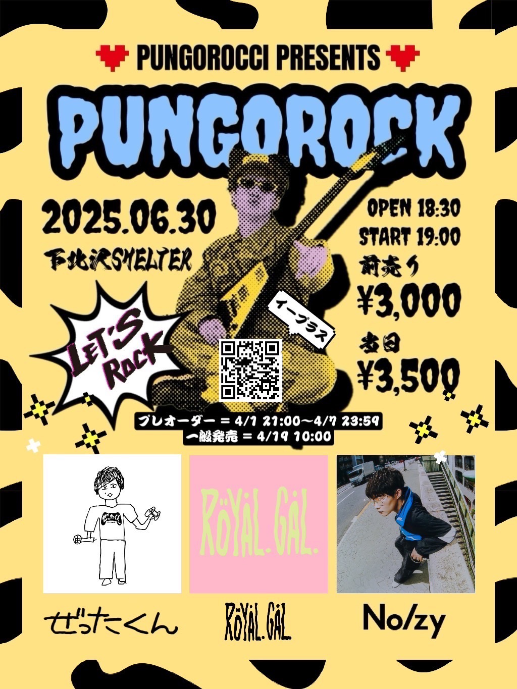 SCHEDULE 2025 06 30 Monday PUNGOROCCI presents 『PUNGOROCK』 OPEN 18:30 - START 19:00 Tweet ロイヤルギャル ぜったくん Nolzy TICKETADV¥3000 / DOOR¥3500 【発売日】 4/1〜e+ https://eplus.jp/sf/detail/4298380001-P0030001 Share