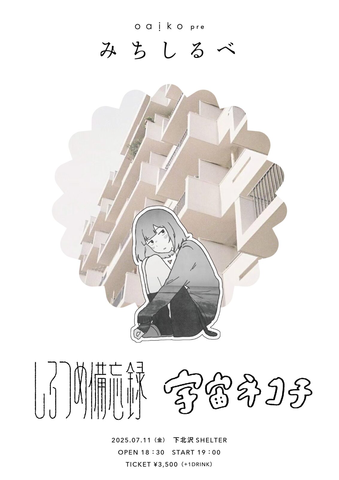 SCHEDULE 2025 07 11 Friday Oaiko pre.「みちしるべ」 OPEN 18:30 - START 19:00 Tweet しろつめ備忘録 宇宙ネコ子 TICKETADV¥3500 / DOOR¥4000 【発売日】 4/26〜チケットぴあ ※オフィシャル先行あり https://w.pia.jp/t/oaiko-michishirube/ #しろつめ備忘録#宇宙ネコ子 Share