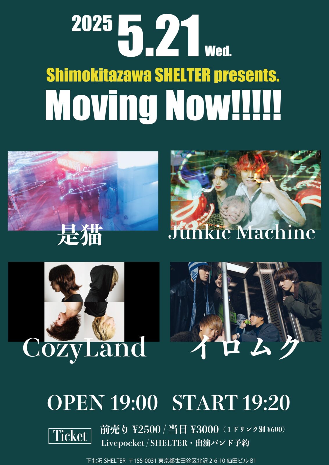 SCHEDULE 2025 05 21 Wednesday 下北沢SHELTER presents. Moving Now!!!!! OPEN 19:00 - START 19:20 Tweet Junkie Machine CozyLand 是猫 イロムク TICKETADV¥2500 / DOOR¥3000 Livepocket:https://t.livepocket.jp/e/shelter5-21event SHELTER予約・バンド予約 #Junkie Machine#CozyLand#是猫#イロムク Share このイベントの予約は締めきりました。