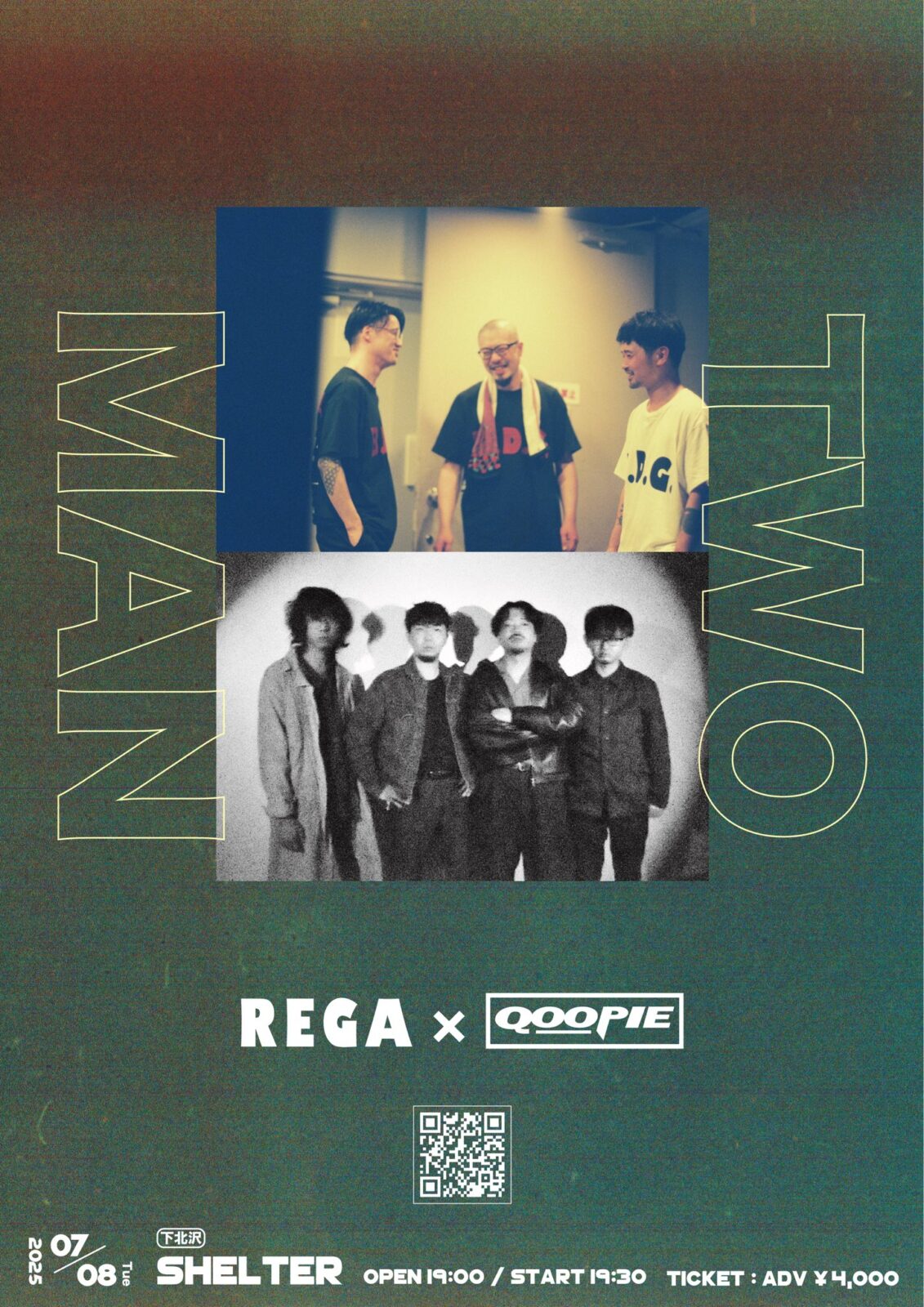 SCHEDULE 2025 07 08 Tuesday Rega × QOOPIE pre. 『TWO MAN』 OPEN 19:00 - START 19:30 Tweet Rega QOOPIE TICKETADV¥4000 バンド 手売り e+:https://eplus.jp/sf/detail/4309110001-P0030001 THANK YOU!! SOLD OUT!!! #Rega#QOOPIE Share