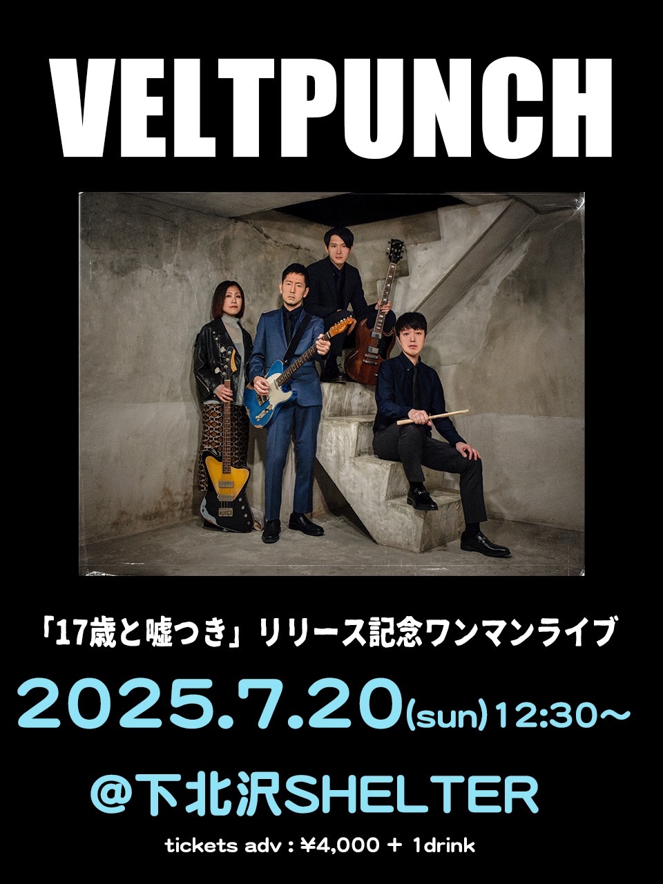 SCHEDULE 2025 07 20 Sunday DAY EVENT 「VELTPUNCH『17歳と嘘つき』リリース記念ワンマンライブ2025」 OPEN 12:00 - START 12:30 Tweet VELTPUNCH TICKETADV¥4000 / DOOR¥4500 【発売日】 e+ プレオーダー:4/18 12:00〜4/23 23:59 一般:5/3〜 https://eplus.jp/sf/detail/4296830001-P0030001 #VELTPUNCH Share