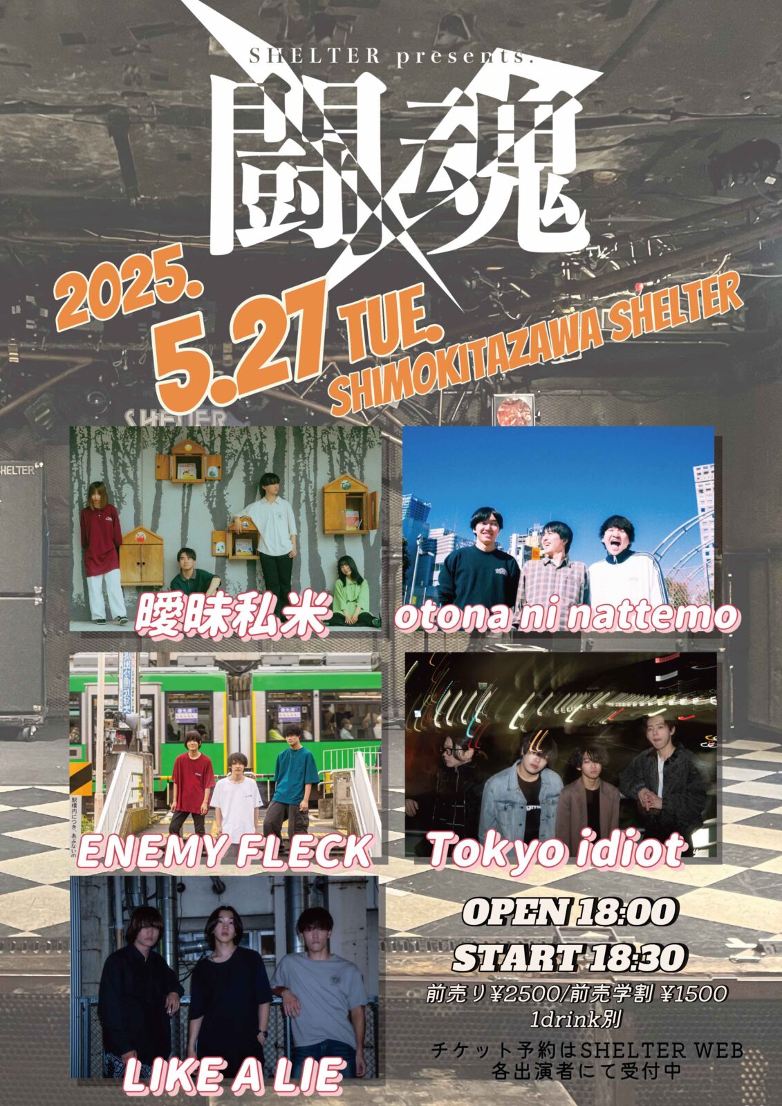SCHEDULE 2025 05 27 Tuesday Shimokitazawa SHELTER pre. 闘魂 OPEN 18:00 - START 18:30 Tweet 曖昧私米 otona ni nattemo Tokyo idiot ENEMY FLECK LIKE A LIE TICKETADV¥2500 / 学割¥1500 チケット:SHELTER WEB予約・各出演者予約 #曖昧私米#otona ni nattemo#Tokyo idiot#ENEMY FLECK Share このイベントの予約は締めきりました。