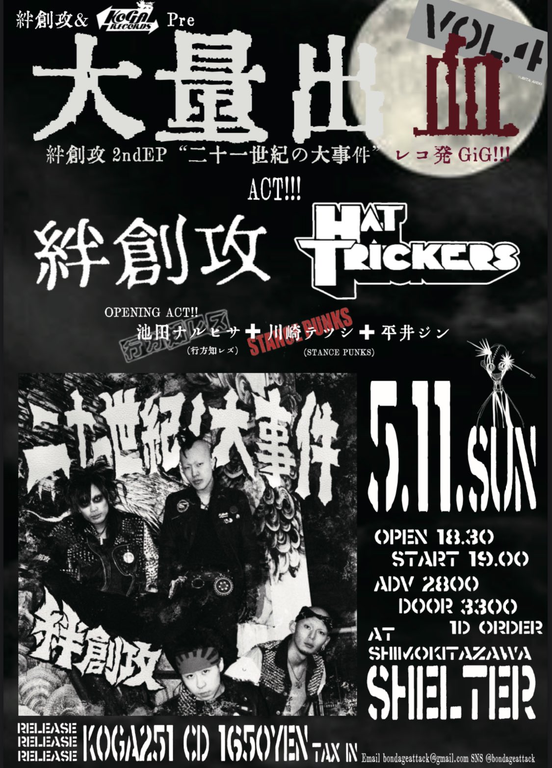 SCHEDULE 2025 05 11 Sunday 絆創攻pre大量出血 Vol.4 【2ndEP”二十一世紀の大事件”レコ発ツーマンGiG】 OPEN 18:30 - START 19:00 Tweet 絆創攻 HAT TRICKERS OPENING ACT: 池田ナルヒサ+川崎テツシ+平井ジン(行方知レズ&STUNCE PUNKS) TICKETADV¥2800 / DOOR¥3300 【発売日】 BAND予約 #絆創攻#HAT TRICKERS Share
