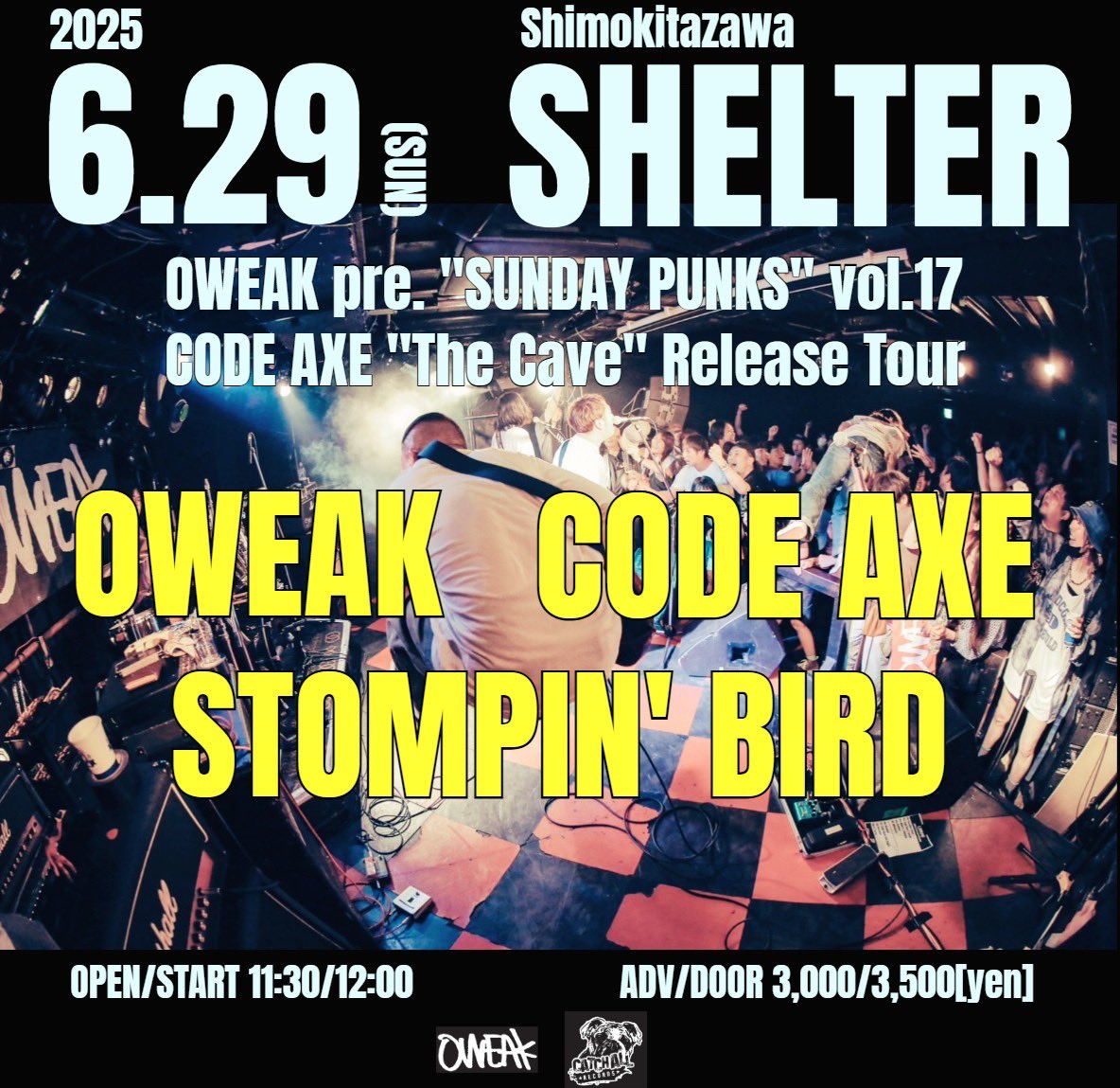 SCHEDULE 2025 06 29 Sunday DAY EVENT OWEAK pre. “SUNDAY PUNKS vol.17” “CODE AXE “The Cave” Release Tour” OPEN 11:30 - START 12:00 Tweet OWEAK STOMPIN’ BIRD CODE AXE TICKETチケット代の齟齬がございました。 ご迷惑お掛けして大変申し訳ございません。 正しくは前売¥3000、当日¥3500(ドリンク代別)となります。 ADV¥3000 / DOOR¥3500 【発売日】 各BAND予約 #OWEAK#STOMPIN’BIRD#CODE AXE Share