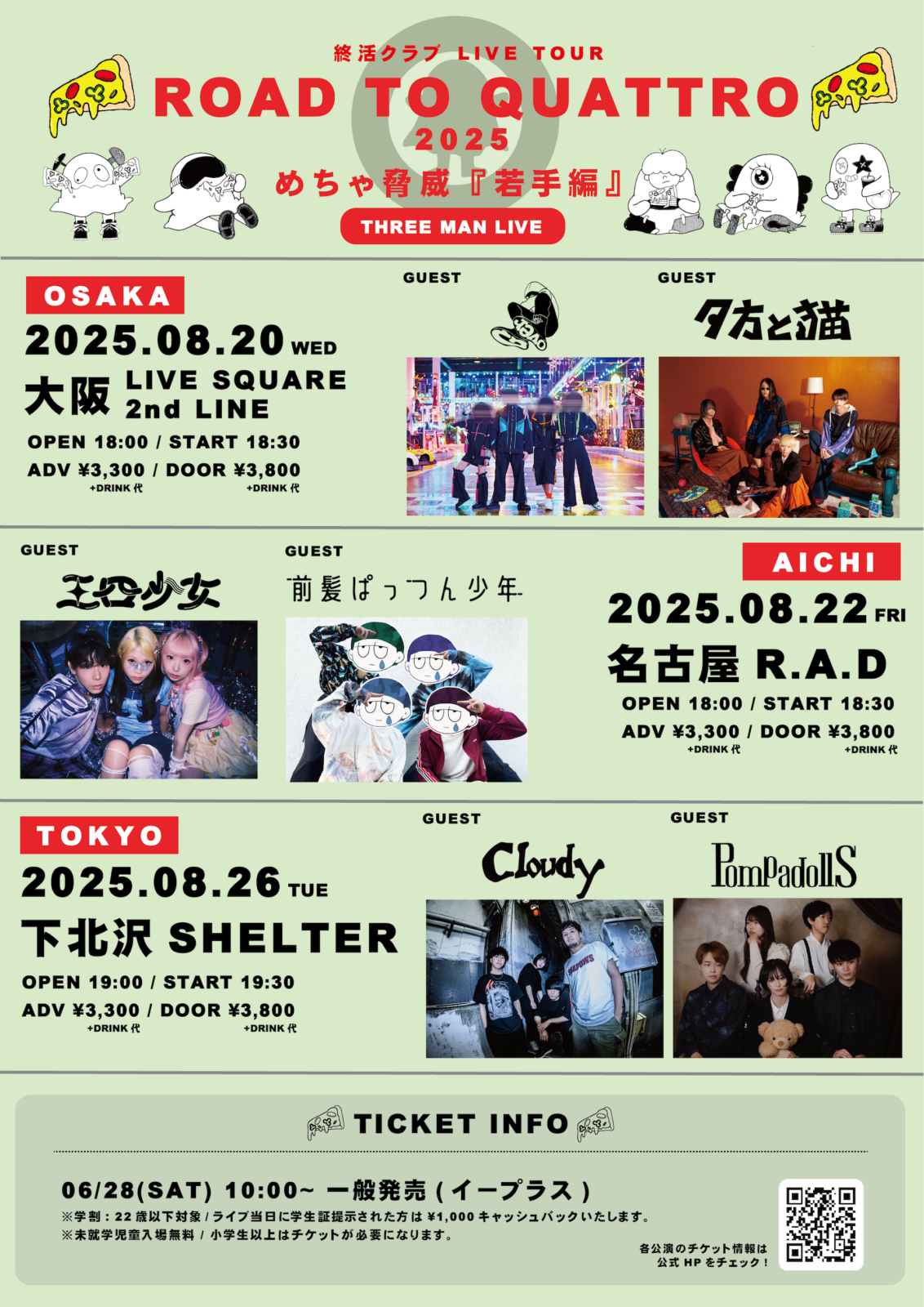 SCHEDULE 2025 08 26 Tuesday 終活クラブ ROAD TO QUATTRO 2025 めちゃ脅威『若手編』 OPEN 19:00 - START 19:30 Tweet 終活クラブ PompadollS Cloudy TICKETADV¥3300 / DOOR¥3800 【発売日】 FC先行:6/17 12:00〜6/22 23:59 https://fanicon.net/ticket/5902 #終活クラブ Share