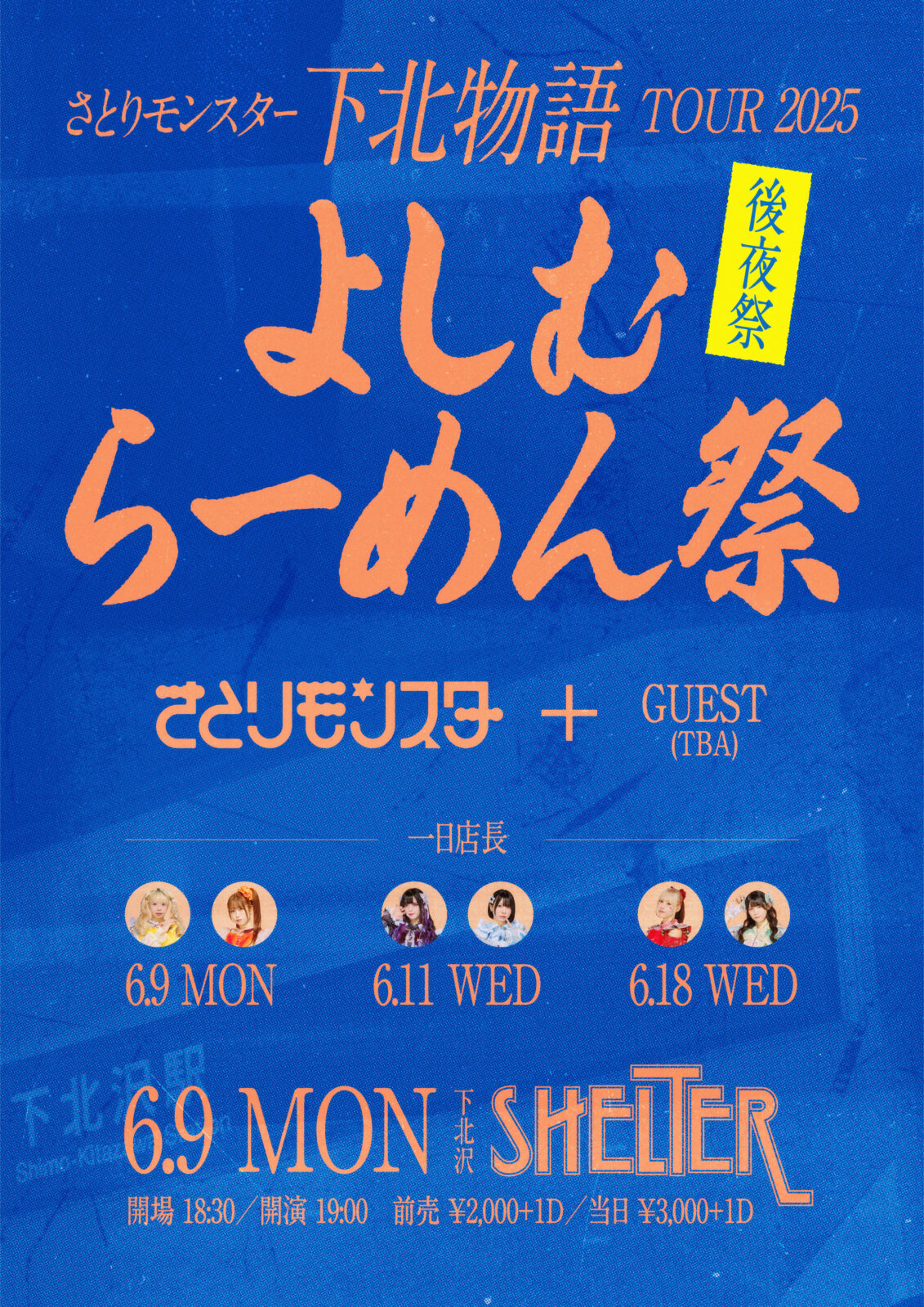 SCHEDULE 2025 06 09 Monday さとりモンスター下北物語TOUR2025 後夜祭 『よしむらーめん祭』 OPEN 18:30 - START 19:00 Tweet さとりモンスター GUEST TBA TICKETADV¥2000 / DOOR¥3000 【発売日】 https://t-dv.com/shimiktamonogatarishelter2025 #さとりモンスター Share