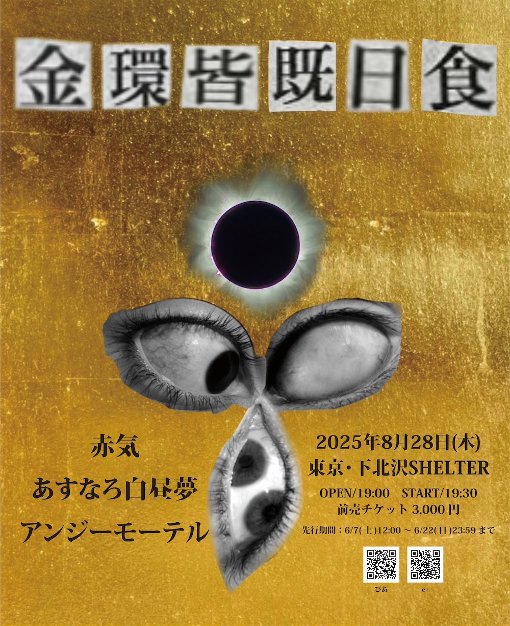 SCHEDULE 2025 08 28 Thursday 赤気、あすなろ白昼夢、アンジーモーテル主催 【金環皆既日食】 OPEN 19:00 - START 19:30 Tweet 赤気 あすなろ白昼夢 アンジーモーテル TICKETADV¥3000 / DOOR¥3500 【発売日】 6/7〜ぴあ・e+ Share
