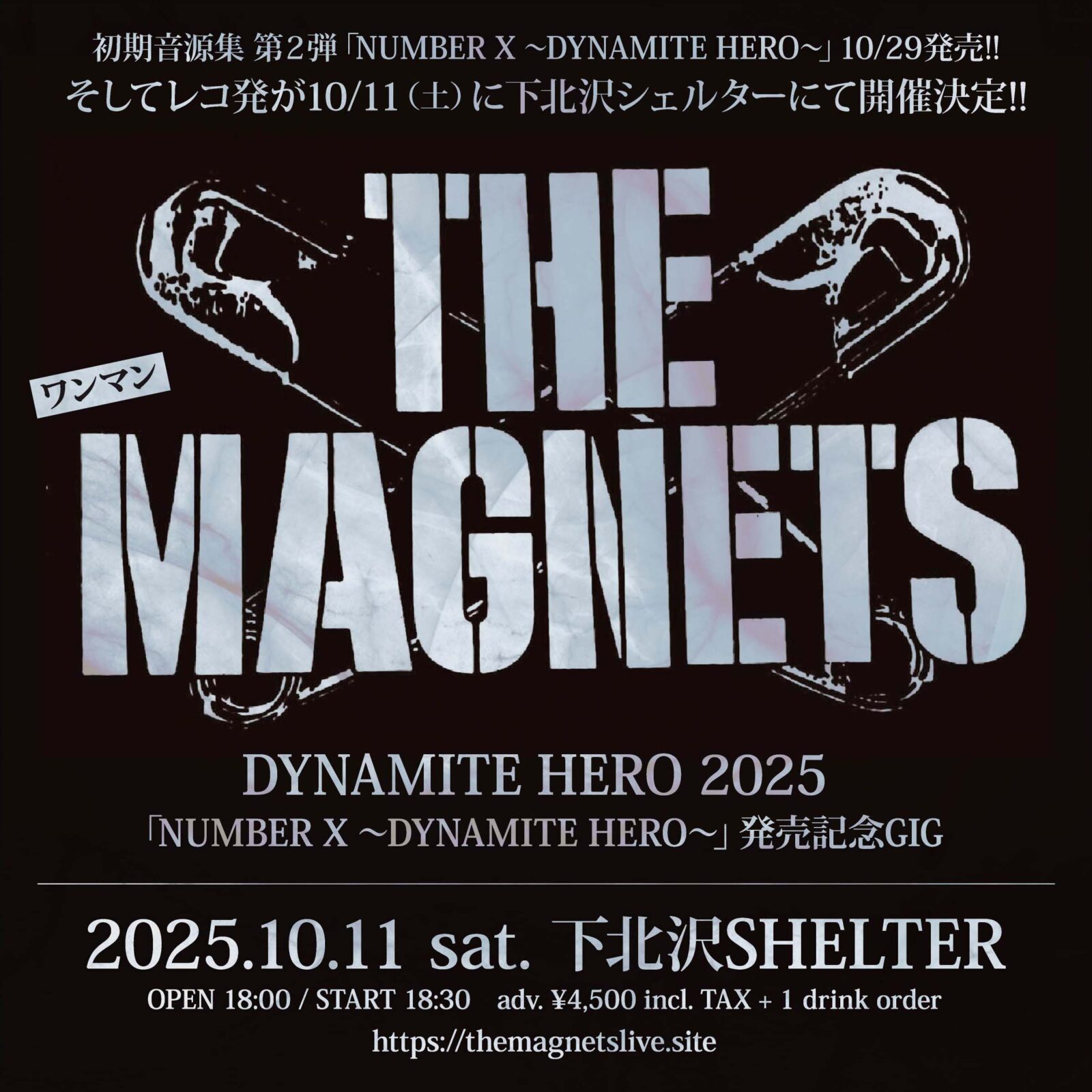 SCHEDULE 2025 10 11 Saturday DYNAMITE HERO 2025 「NUMBER X〜DYNAMITE HERO〜」発売記念GIG OPEN 18:00 - START 18:30 Tweet THE MAGNETS DJ:ISHIKAWA TICKETADV¥4500 / DOOR¥5000 【発売日】 7/18 18時〜e+ #THE MAGNETS Share