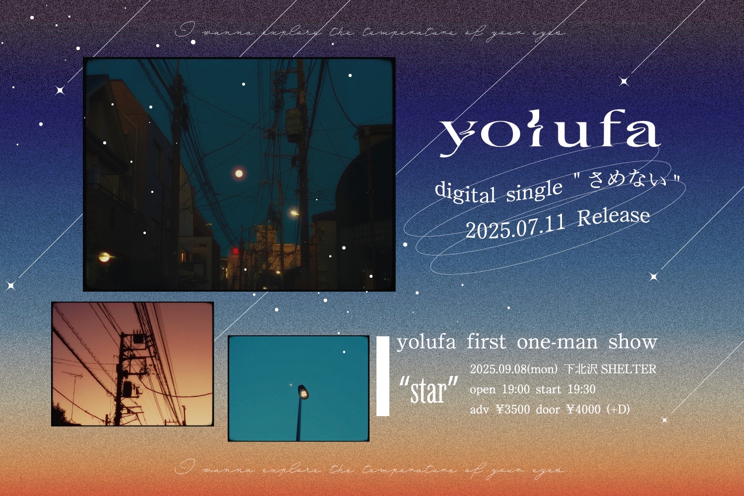 SCHEDULE 2025 09 08 Monday yolufa first one-man show “star” OPEN 19:00 - START 19:30 Tweet yolufa TICKETADV¥3500 / DOOR¥4000 THANK YOU!! SOLD OUT!!! 入金期間:726(土)13:00~7/28(月)21:00 https://eplus.jp/sf/detail/4359950001-P0030001 #yolufa Share