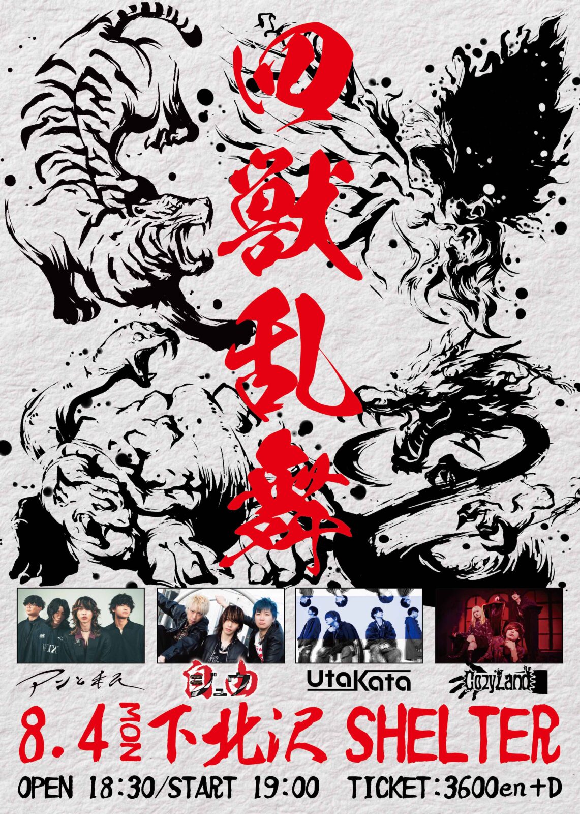 SCHEDULE 2025 08 04 Monday 『 四獣乱舞 』 OPEN 18:30 - START 19:00 Tweet CozyLand ジュウ アンと私 UtaKata TICKETADV¥3600 TICKET:https://t.livepocket.jp/e/2025_8_4 #CozyLand#ジュウ#アンと私#UtaKata Share このイベントの予約は締めきりました。