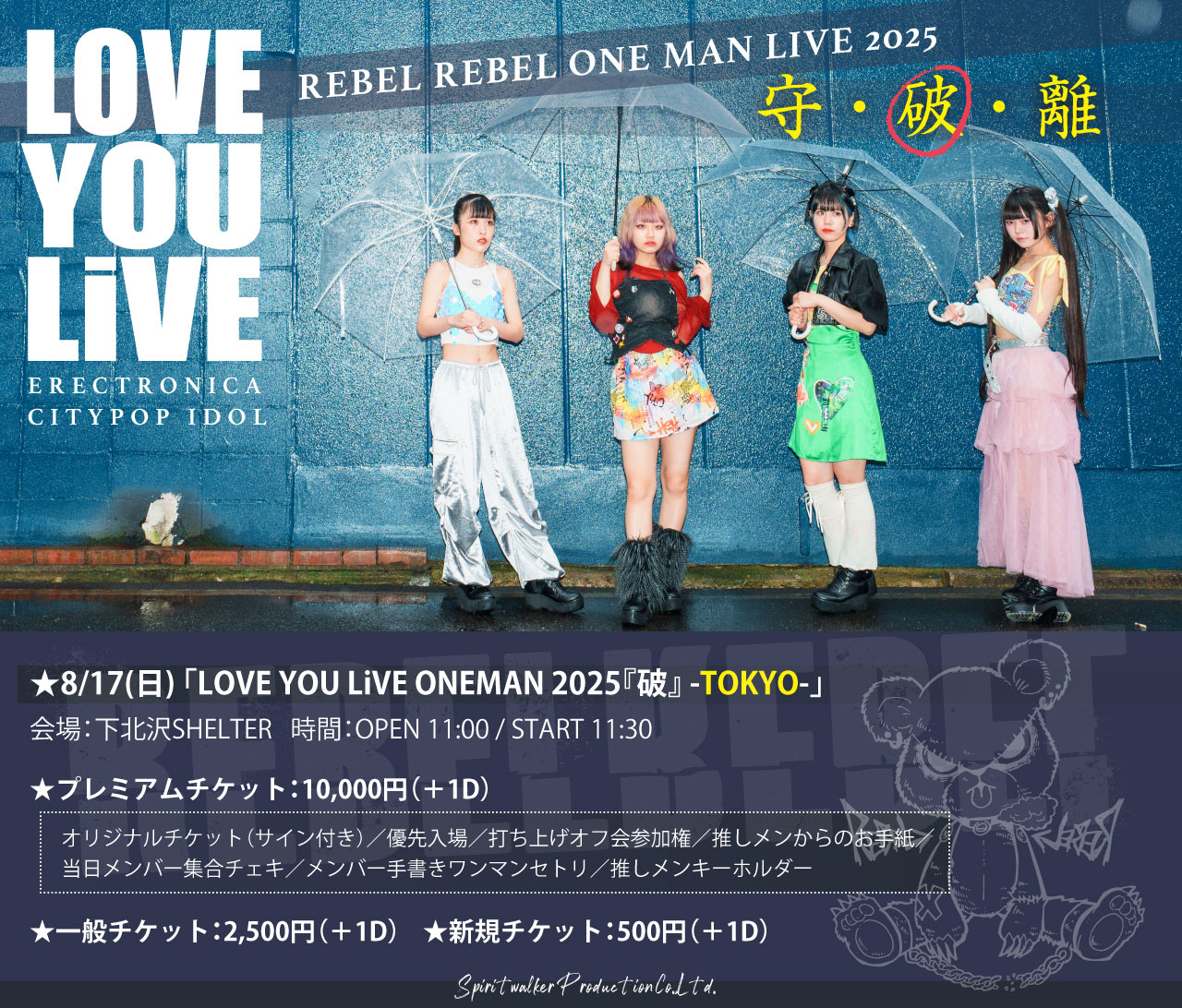 SCHEDULE 2025 08 17 Sunday DAY EVENT 「LOVE YOU LiVE ONEMAN 2025『破』 -TOKYO-」 OPEN 11:00 - START 11:30 Tweet REBEL REBEL TICKETプレミアムチケット:10000円 一般チケット:2500円(+1D) 新規チケット500円(+1D) 【発売日】 TIGET #REBEL REBEL Share