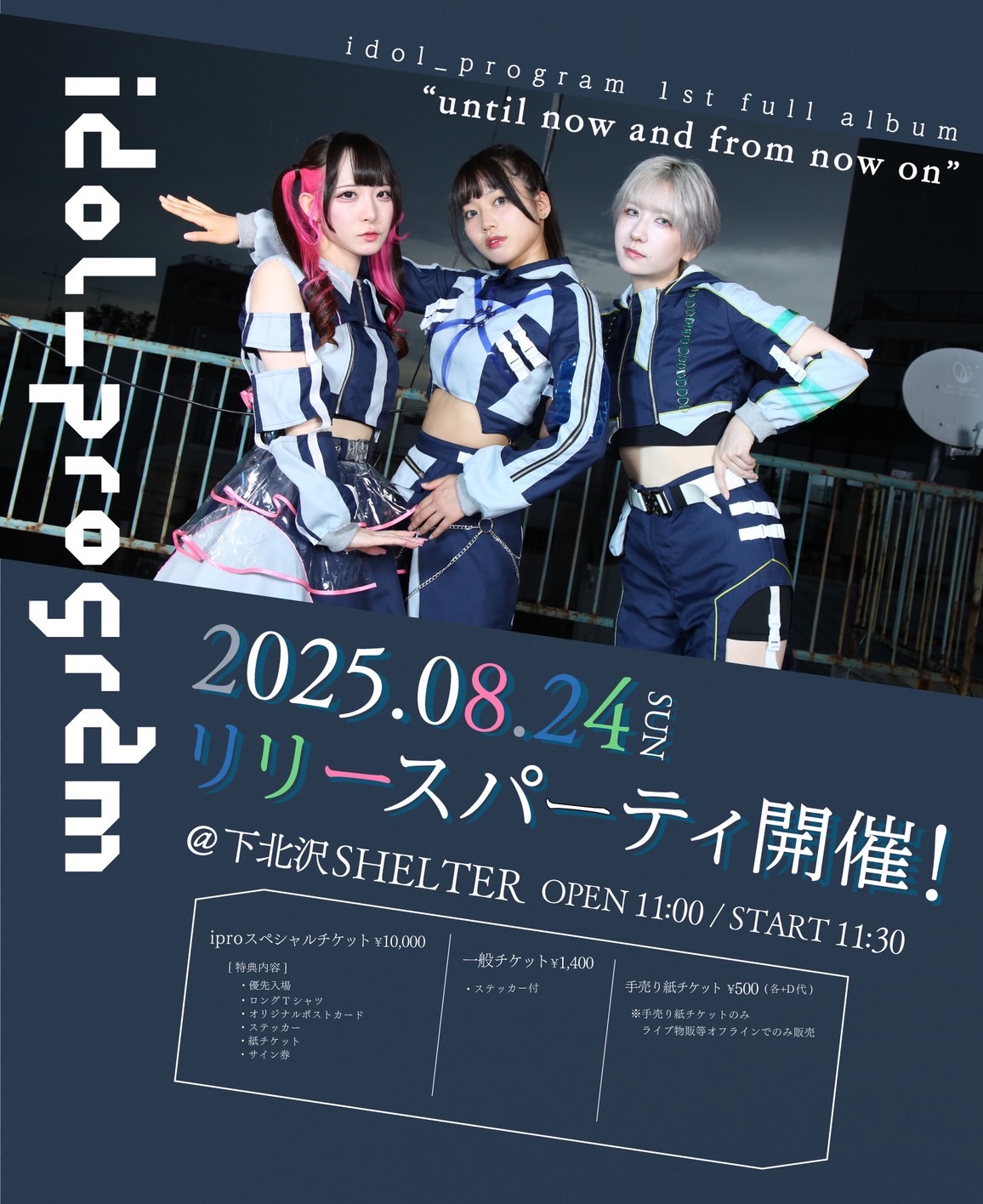 SCHEDULE 2025 08 24 Sunday DAY EVENT idol_program 1st full album “until now and from now on” OPEN 11:00 - START 11:30 Tweet idol_program TICKETiproスペシャル¥10000 / 一般1400 / 手売¥500 Share