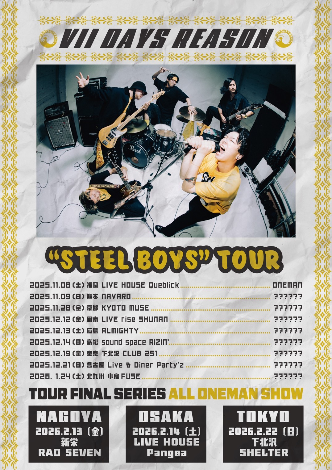 SCHEDULE 2026 02 22 Sunday VII DAYS REASON ” STEEL BOYS ” TOUR OPEN 18:00 - START 18:30 Tweet VII DAYS REASON TICKETADV¥3000 / DOOR¥3500 【発売日】 9/4〜e+ https://eplus.jp/sf/detail/4391230001-P0030001 #VII DAYS REASON Share