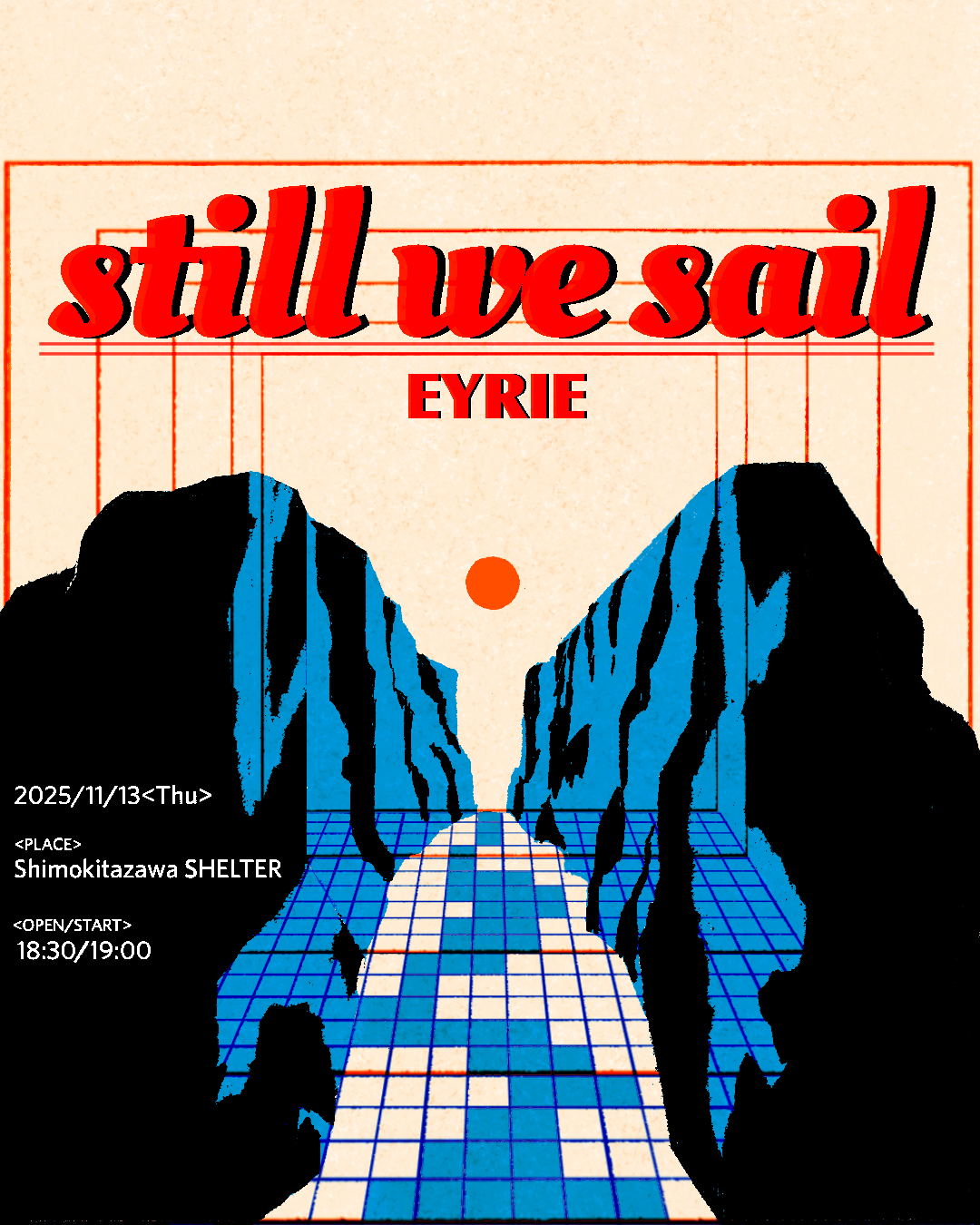 SCHEDULE 2025 11 13 Thursday still we sail OPEN 18:30 - START 19:00 Tweet EYRIE TICKETADV¥4000 / 学割¥2500 【発売日】 チケットぴあ オフィシャル先行:9/17〜9/28 23:59 #EYRIE Share