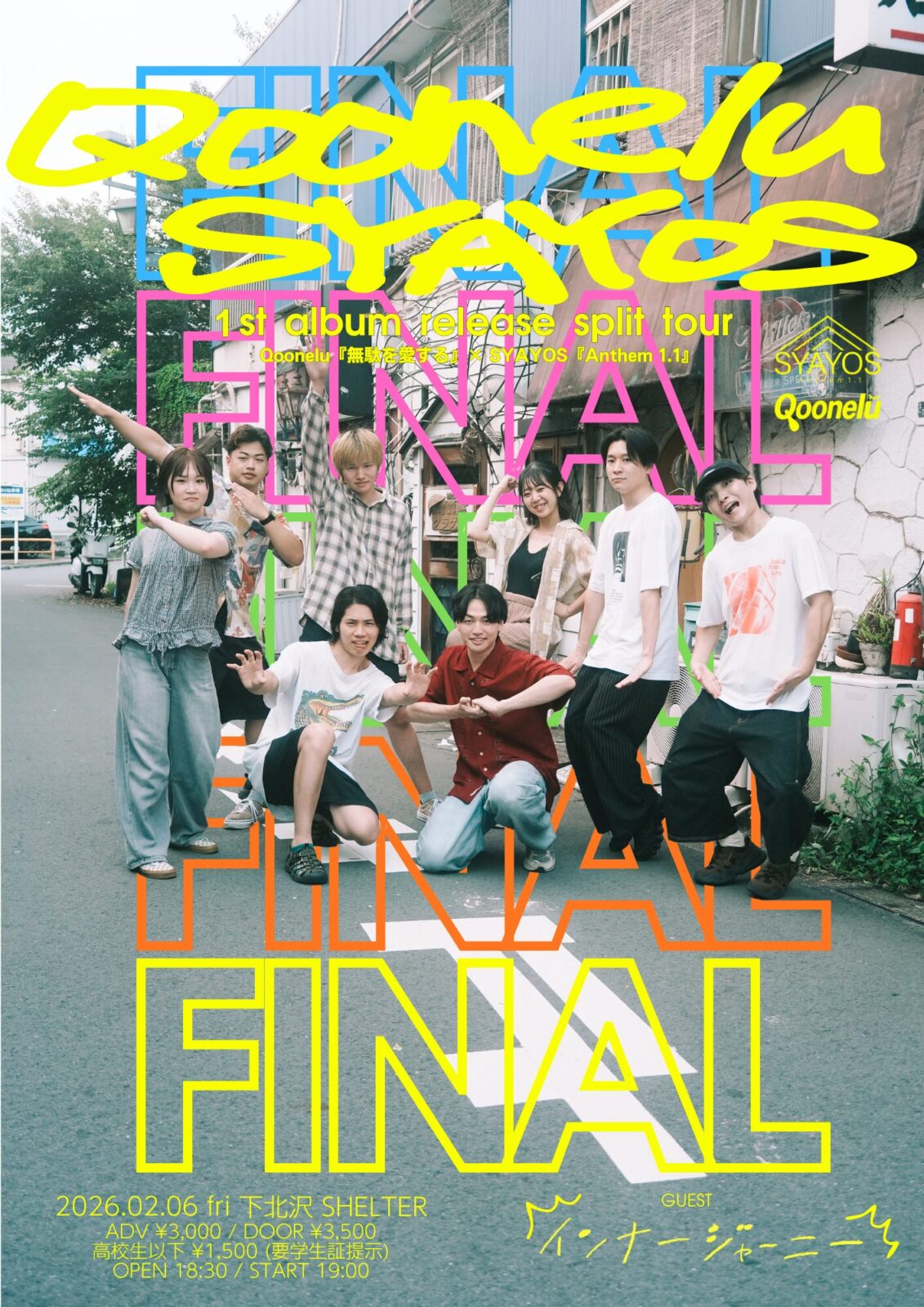 SCHEDULE 2026 02 06 Friday Qoonelu『無駄を愛する』× SYAYOS『Anthem 1.1』 1st Album release Split Tour FINAL!!! OPEN 18:30 - START 19:00 Tweet Qoonelu SYAYOS インナージャーニー TICKETADV¥3000 / DOOR¥3500 / 学生(高校生以下)¥1500※要学生証 【発売日】 手売りチケット Livepocket https://t.livepocket.jp/e/qoonelu_syayos BAND予約 【入場順】 手売り→Livepocket→予約 #Qoonelu#SYAYOS#インナージャーニー Share