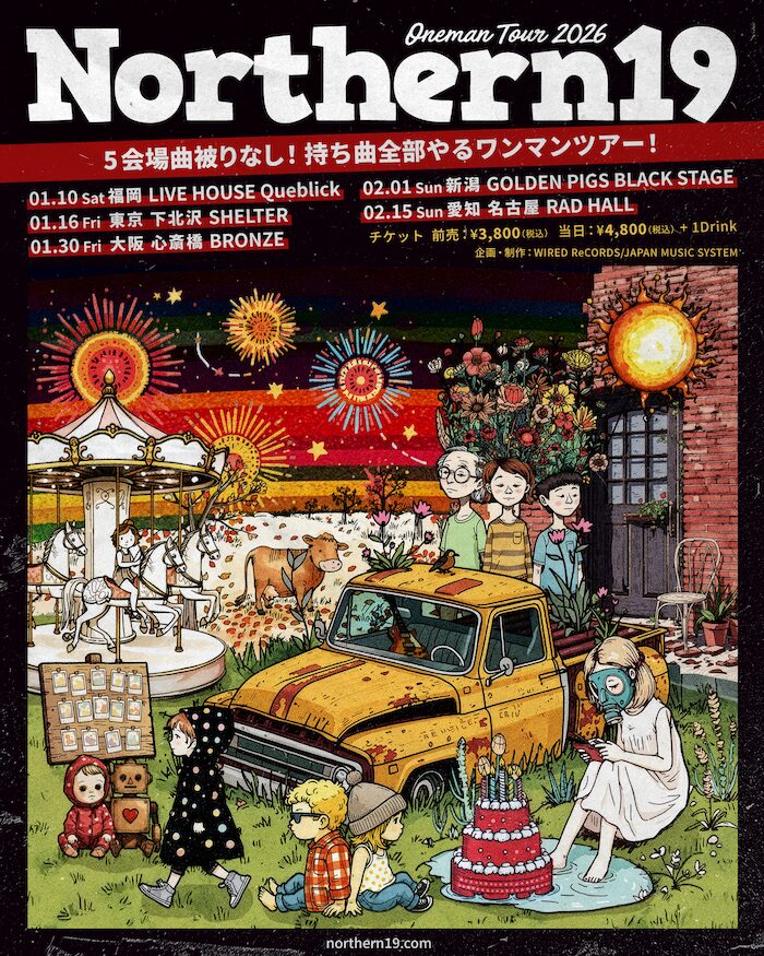 SCHEDULE 2026 01 16 Friday Northern19 “5会場曲被りなし!持ち曲全部やるワンマンツアー!” OPEN 18:30 - START 19:00 Tweet Northern19 TICKETADV¥3800 / DOOR¥4800 【発売日】 チケットぴあ #Northern19 Share