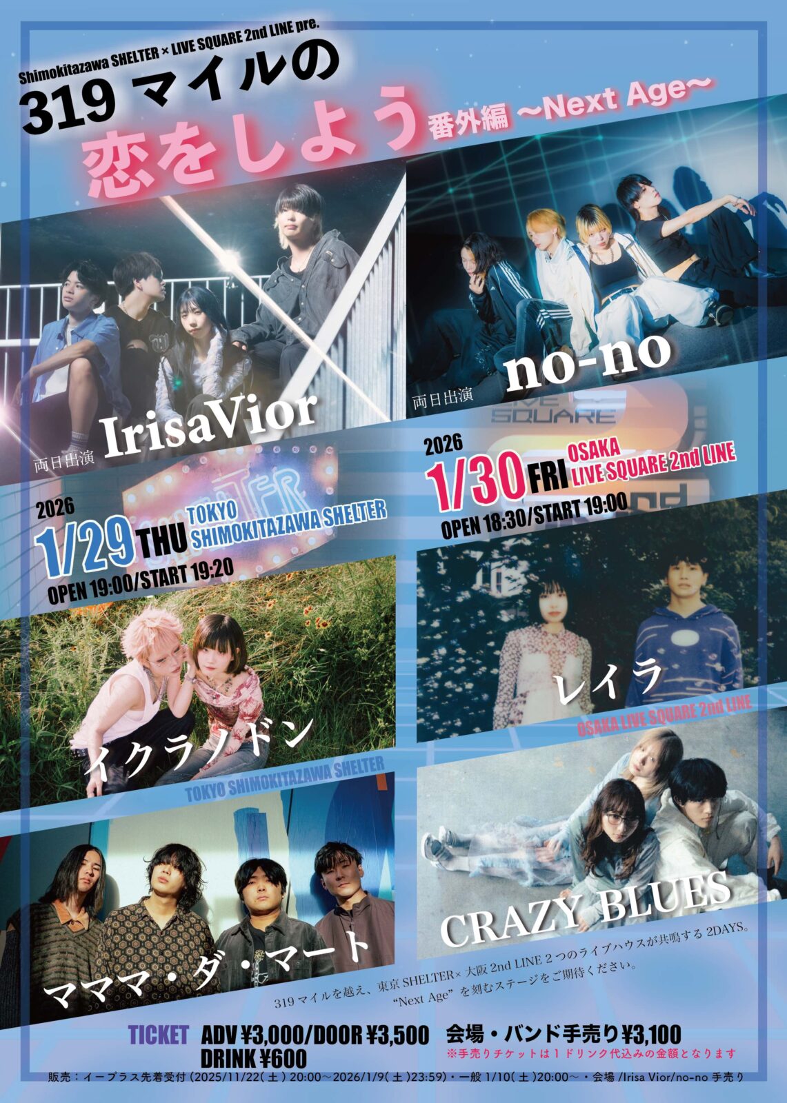 SCHEDULE 2026 01 29 Thursday 下北沢SHELTER × LIVE SQUARE 2nd LINE pre. 319マイルの恋をしよう 番外編 〜Next Age〜 OPEN 19:00 - START 19:20 Tweet IrisaVior no-no イクラノドン マママ・ダ・マート TICKETADV¥3000 / DOOR¥3500 【発売日】 イープラス:先行/一般 https://eplus.jp/ss-ls2l-2026/ 会場/IrisaVior/no-no割引手売りチケット ¥3100(1ドリンク込み) #IrisaVior#no-no#イクラノドン#マママ・ダ・マート Share チケット予約