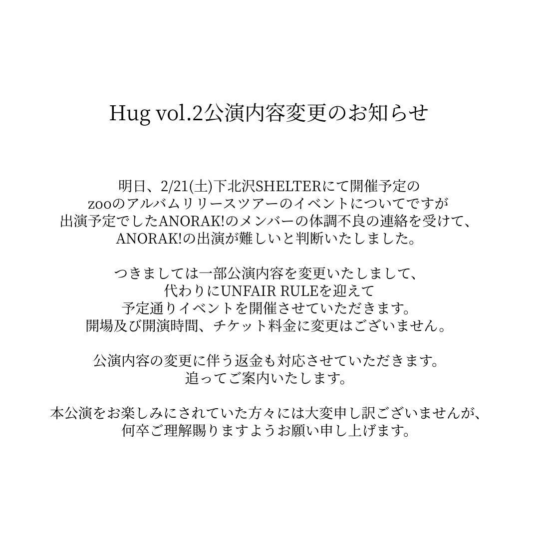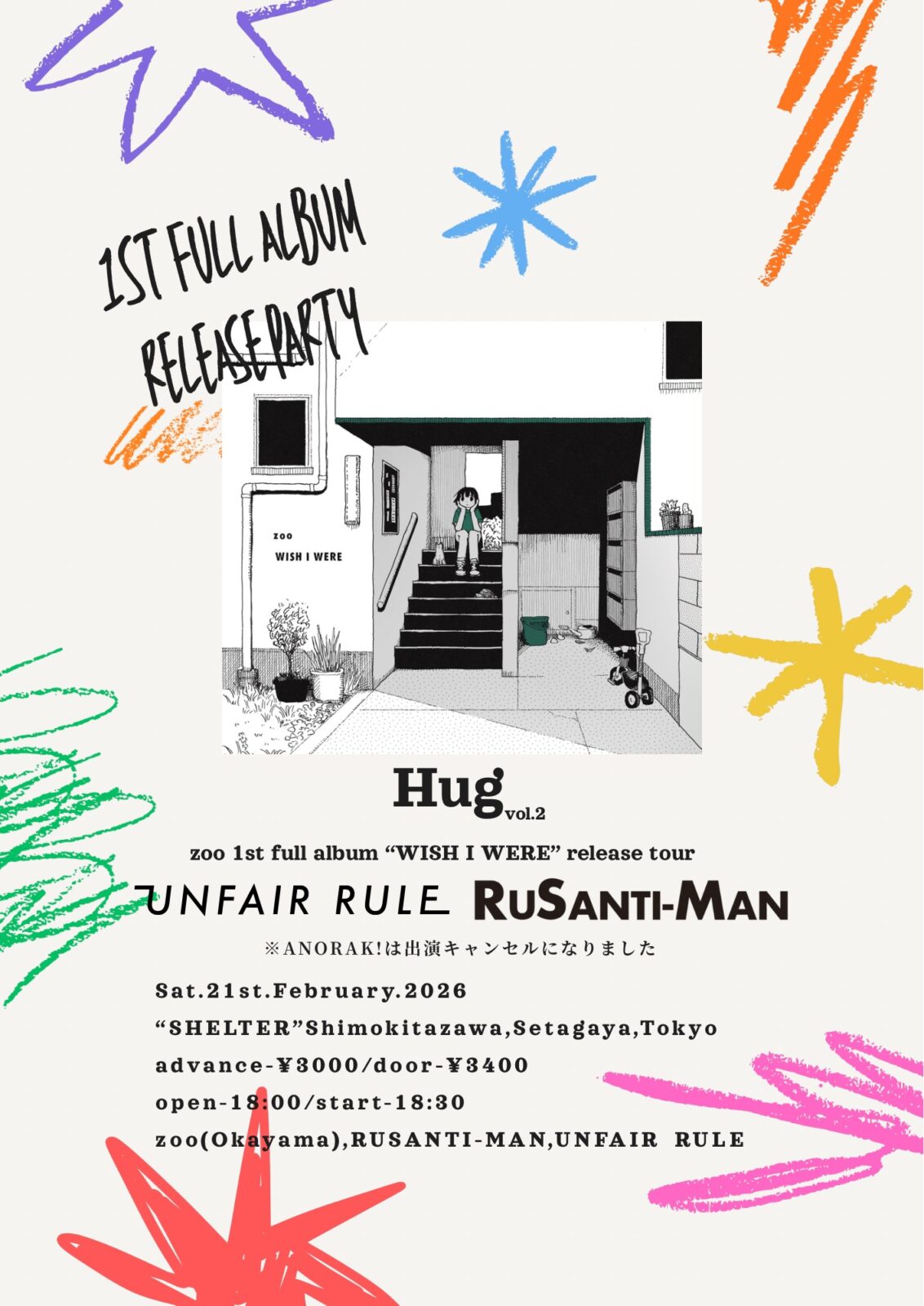 SCHEDULE 2026 02 21 Saturday Hug vol.2 zoo 1st full album “WISH I WERE” release tour OPEN 18:00 - START 18:30 Tweet zoo(岡山) ルサンチマン ANORAK!(※出演キャンセルとなりました) TICKETADV¥3000 / DOOR¥3400 【発売日】 https://t.livepocket.jp/e/hj_t5 #zoo#ルサンチマン Share