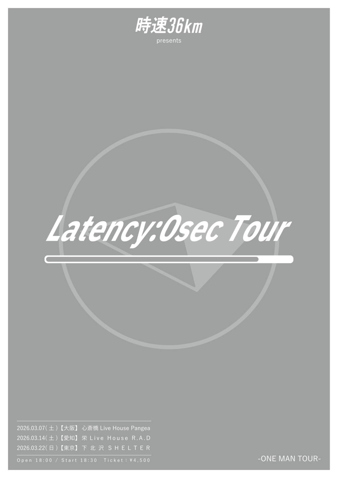 SCHEDULE 2026 03 22 Sunday 時速36km presents “Latency:0sec Tour” OPEN 18:00 - START 18:30 Tweet 時速36km TICKETADV¥4500 【発売日】 チケットぴあ #時速36km Share