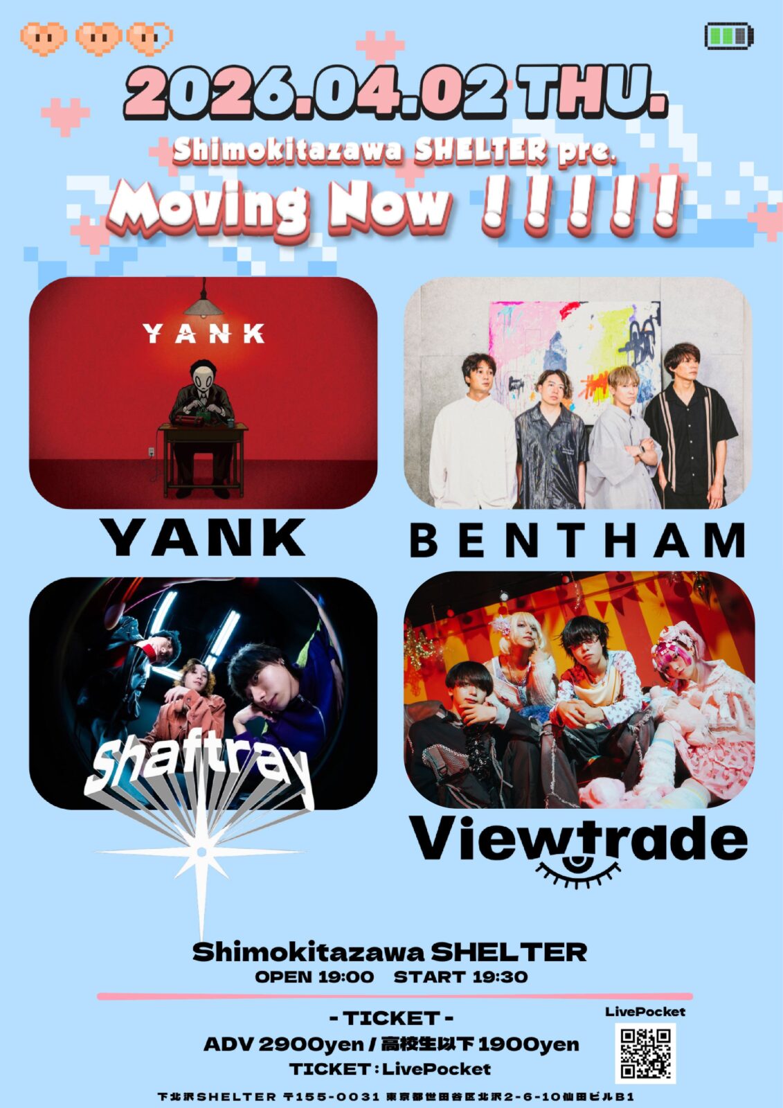 SCHEDULE 2026 04 02 Thursday Shimokitazawa SHELTER pre. Movin Now !!!!! OPEN 19:00 - START 19:30 Tweet Shaftray YANK Bentham Viewtrade TICKETADV¥2900 / DOOR¥3500 高校生以下¥1900 【発売】 LivePocket:https://livepocket.jp/e/khjf3 #Shaftray#YANK#Bentham#Viewtrade Share