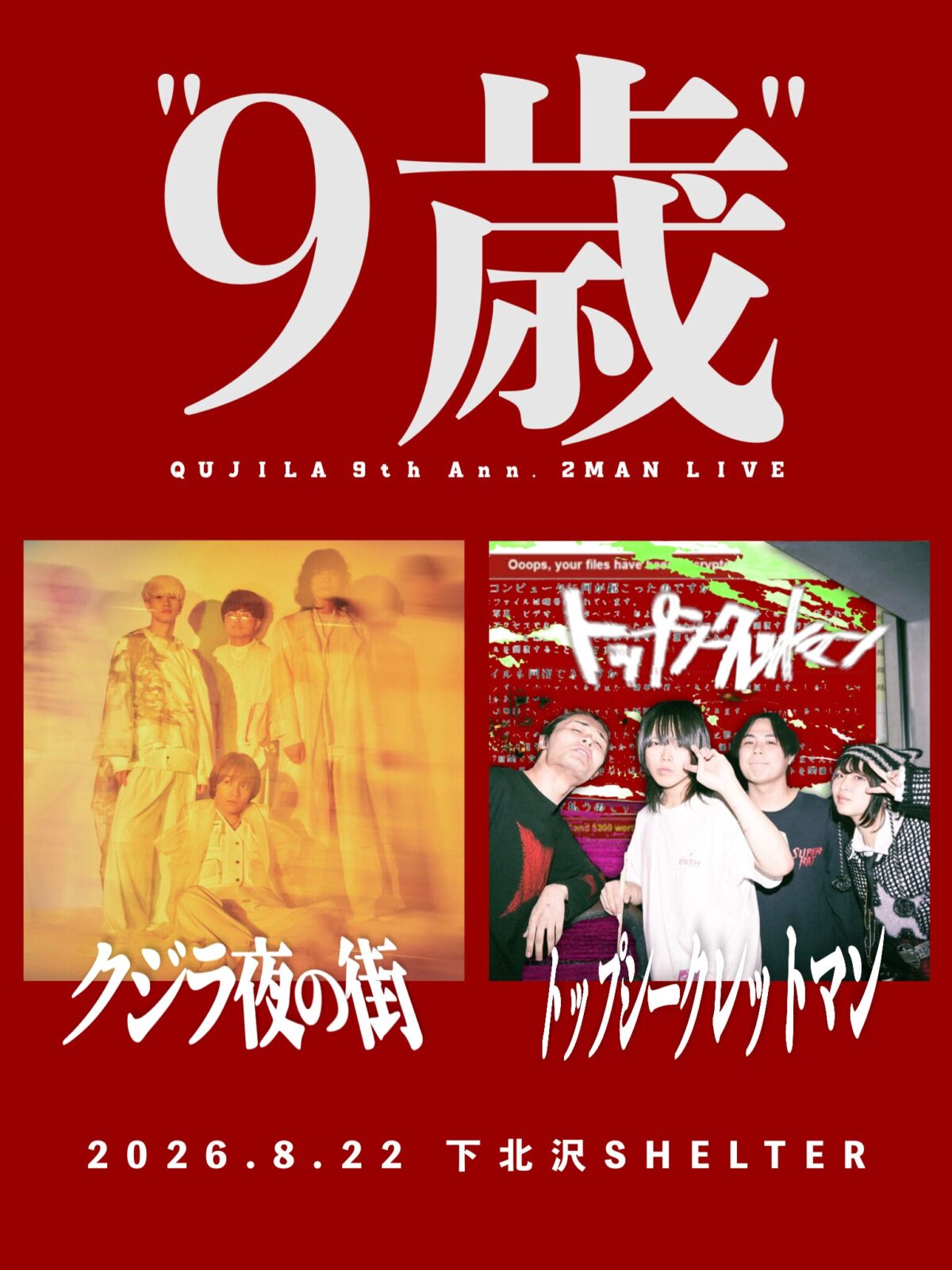 SCHEDULE 2026 08 22 Saturday “9歳” TOKYO【2 MAN LIVE】MONTHLY OPEN 17:30 - START 18:00 Tweet クジラ夜の街 トップシークレットマン TICKETADV¥5000 / DOOR¥未定 【2次先行】 e+ 受付期間:2026/3/25(水)20:00~2026/4/5(日)23:59 【発売日】 5/9〜e+・チケットぴあ・ローソンチケット お問い合わせ:DISK GARAGE https://info.diskgarage.com/ #クジラ夜の街#トップシークレットマン Share
