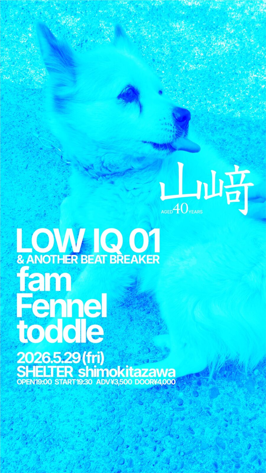 SCHEDULE 2026 05 29 Friday “山﨑40年” OPEN 19:00 - START 19:30 Tweet LOW IQ 01 & ANOTHER BEAT BREAKER fam Fennel toddle TICKETADV¥3500 / DOOR¥4000 【発売日】 3/5(THU)21時〜Livepocket https://livepocket.jp/e/srjy2 #LOW IQ 01 & ANOTHER BEAT BREAKER#fam#Fennel Share
