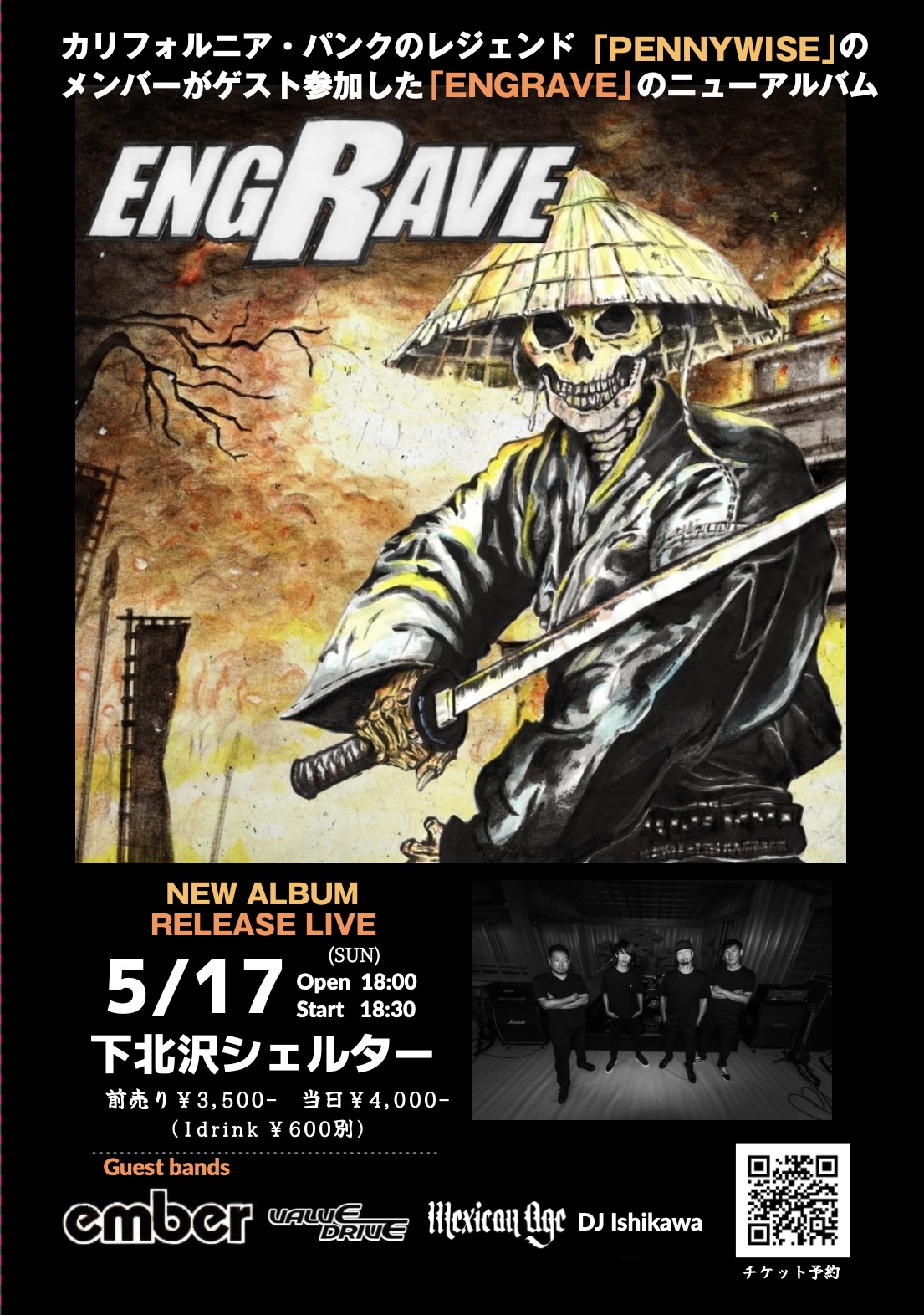 SCHEDULE 2026 05 17 Sunday ENGRAVE New Album Release LIVE OPEN 18:00 - START 18:30 Tweet ENGRAVE ember VALVE DRIVE MEXICAN AGE DJ:Ishikawa TICKETADV¥3500 / DOOR¥4000 【発売日】 主催予約 https://select-type.com/ev/?ev=gXI53c0wXFU #ENGRAVE Share