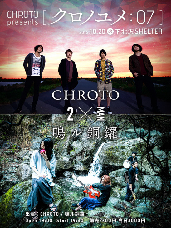 SCHEDULE 2015 10 20 Tuesday CHROTO presents [クロノユメ:07] – CHROTO × 鳴ル銅鑼【2MAN】- OPEN 19:00 - START 19:30 Tweet CHROTO 鳴ル銅鑼 TICKETADV¥2500 / DOOR¥3000 【発売日】 8/1〜e+・各BAND予約 Share