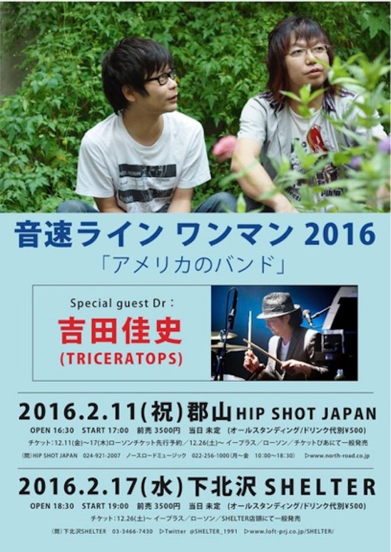 SCHEDULE 2016 02 17 Wednesday 音速ラインワンマン2016 「アメリカのバンド」 OPEN 18:30 - START 19:00 Tweet 音速ライン Special guest Dr 吉田佳史(TRICERATOPS) TICKETADV¥3500 / DOOR¥未定【発売日】12/26〜ローソンチケット(Lコード74533)・e+・SHELTER店頭 Share