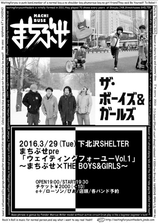 SCHEDULE 2016 03 29 Tuesday まちぶせ presents「ウェイティングフォーユーvol.1」 OPEN 19:00 - START 19:30 Tweet まちぶせ THE BOYS&GIRLS TICKETADV¥2000 / DOOR¥2500 (1ドリンク別) [発売]PIA・LAWSON・eplus・SHELTER 1/16〜 ●Pコード:P:286-590/ Lコード:70611 Share