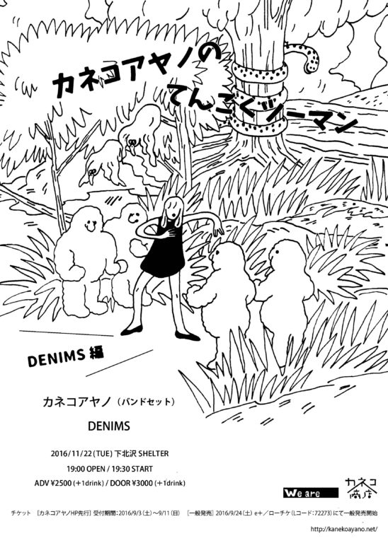 SCHEDULE 2016 11 22 Tuesday カネコアヤノのてんごくツーマン~DENIMS編~ OPEN 19:00 - START 19:30 Tweet カネコアヤノ(バンドセット) DENIMS TICKETADV¥2500 / DOOR¥3000 【発売日】 e+プレオーダー受付 9/3 12:00〜9/11 18:00 9/24〜ローソンチケット(L:72273)・e+・SHELTER店頭 Share