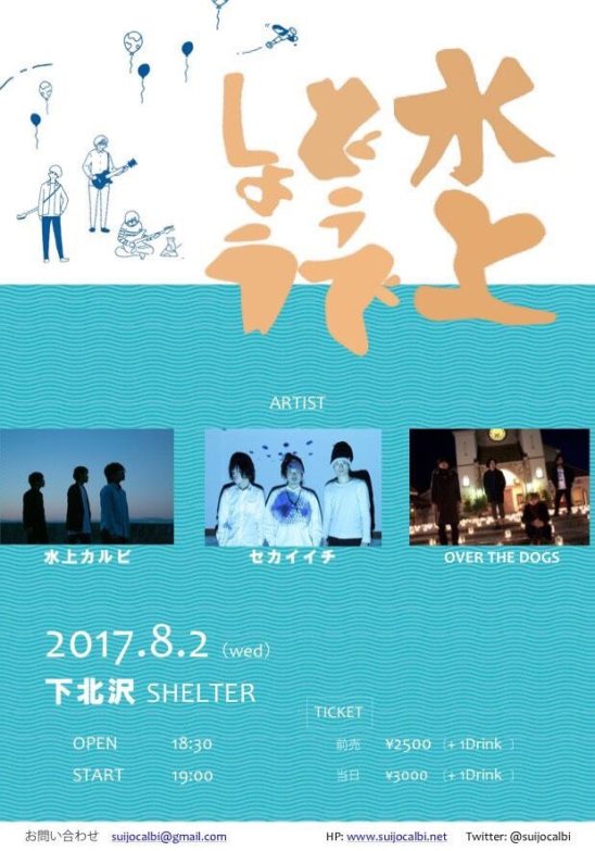 SCHEDULE 2017 08 02 Wednesday 水上どうでしょう OPEN 18:30 - START 19:00 Tweet 水上カルビ セカイイチ OVER THE DOGS O.A:そのうちやる音 TICKETADV¥2500 / DOOR¥3000 【発売日】 6/16〜e+・SHELTER店頭・BAND予約 Share