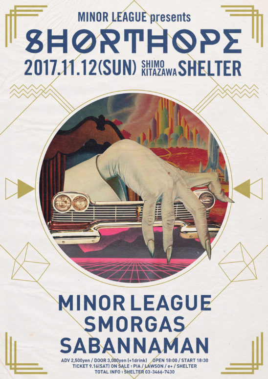 SCHEDULE 2017 11 12 Sunday MINOR LEAGUE presents SHORT HOPE OPEN 18:00 - START 18:30 Tweet MINOR LEAGUE SMORGAS SABANNAMAN TICKETADV¥2500 / DOOR¥3000 【発売日】 9/16〜ぴあ(P:345-496)・LAWSON(L:73750)・e+・SHELTER店頭 ※来場者特典!画像のステッカープレゼント(先着100名) デザインはWRENCH松田さん! Share