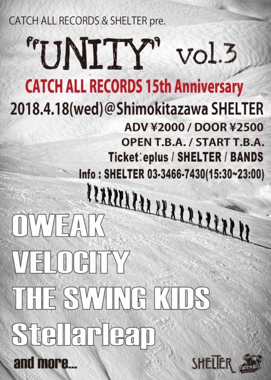 SCHEDULE 2018 04 18 Wednesday CATCH ALL RECORDS&SHELTER pre. “UNITY” vol.3 -CATCH ALL RECORDS 15th Anniversary- OPEN 18:00 - START 18:30 Tweet OWEAK VELOCITY THE SWING KIDS Stellarleap readingnote Checker Spiral TICKETADV¥2000 / DOOR¥2500 【発売日】 e+・各BAND予約 Share