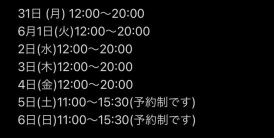 平日 OPEN 12:00 CLOSE 15:00〜20:00※夜にイベントが入ることがございますので日によって変わります。別途アナウンス致します。
